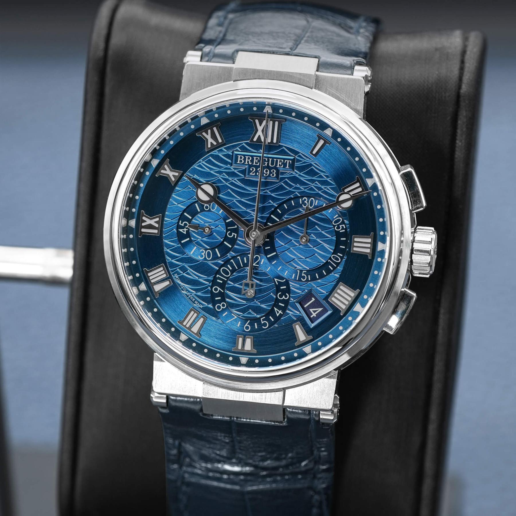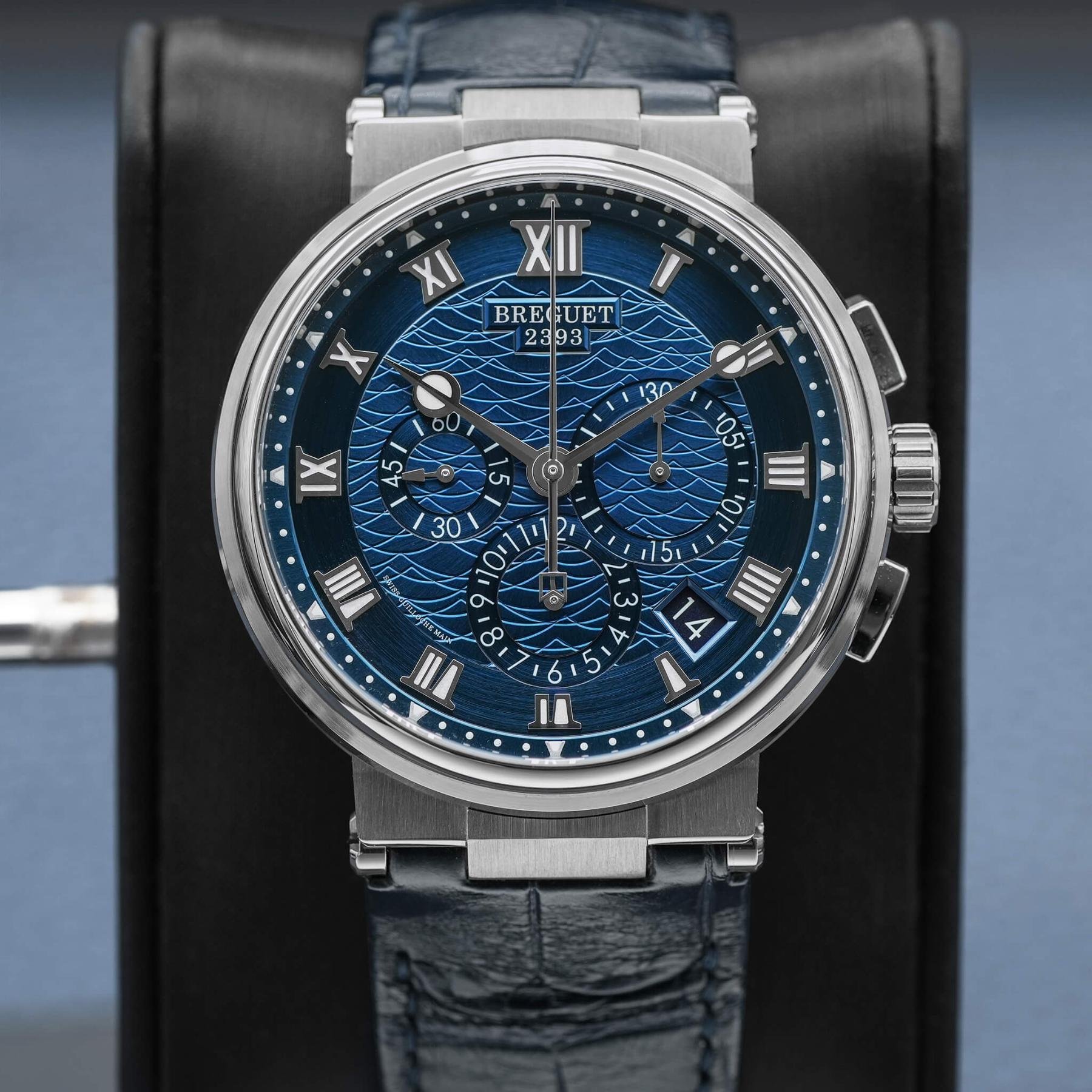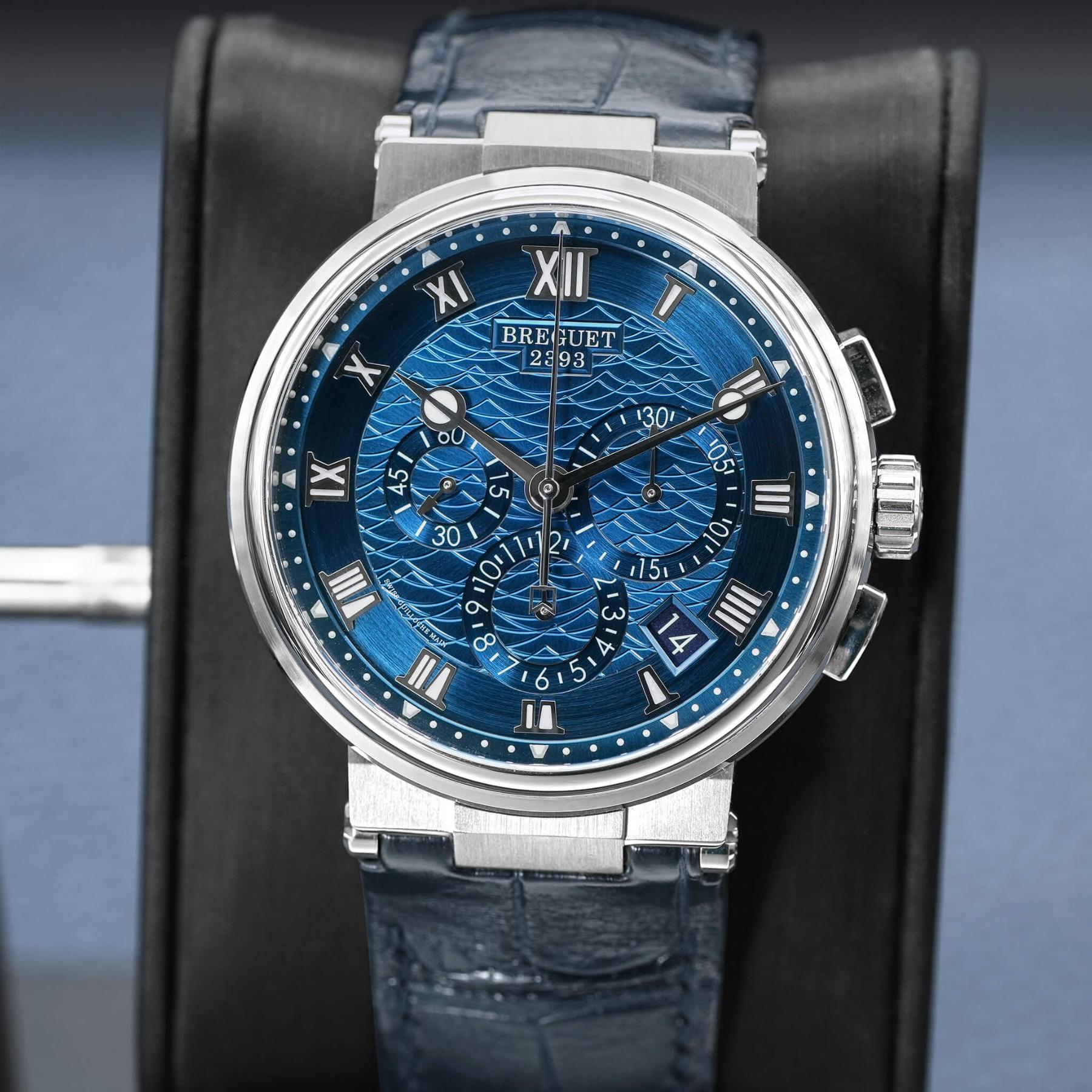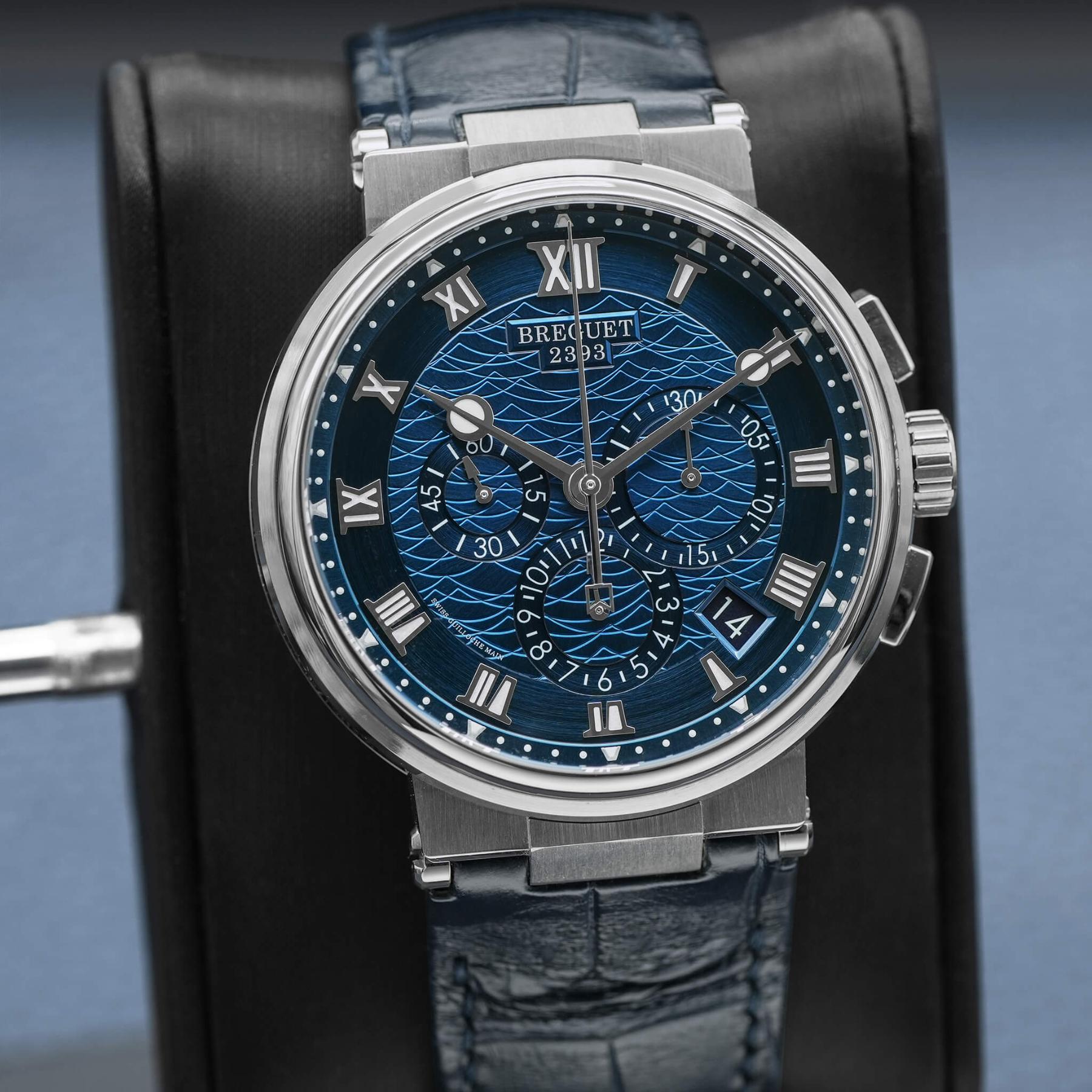 The Breguet Marine Chronographe 42.3mm (Ref. 5527BB/Y2/9WV) is a refined combination of technical excellence and sophisticated design. Crafted in 18k white gold, it features a striking blue guilloché dial with wave motif, a fly-back chronograph, and date display — all powered by the Caliber 582QA automatic movement offering a 48-hour power reserve. With 100 m water resistance and a sapphire case-back showcasing the meticulously finished movement, this watch stands out as both sporty and luxurious. This example, complete with box and papers, is a superb choice for enthusiasts who appreciate Breguet’s heritage in fine watchmaking and maritime-inspired aesthetic.