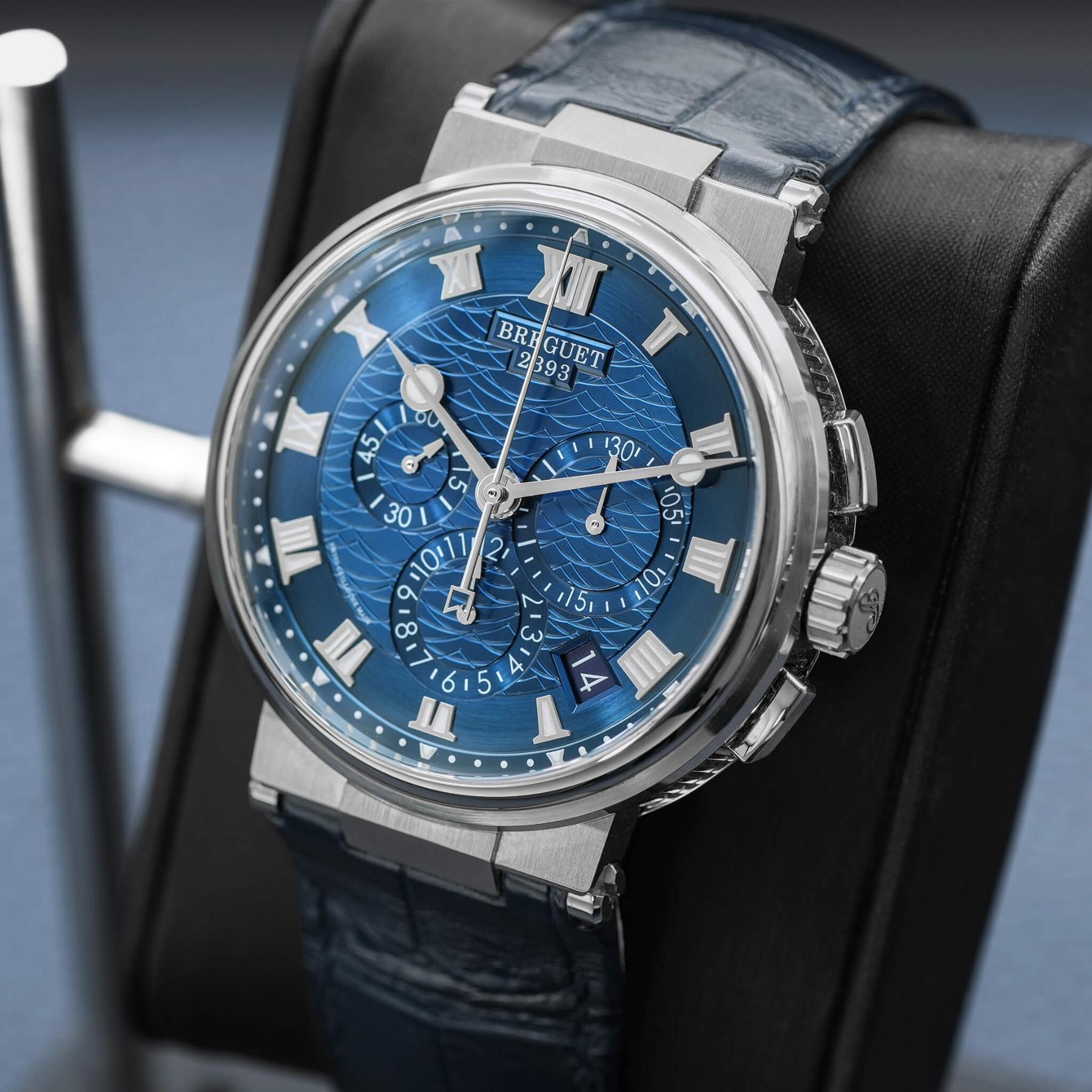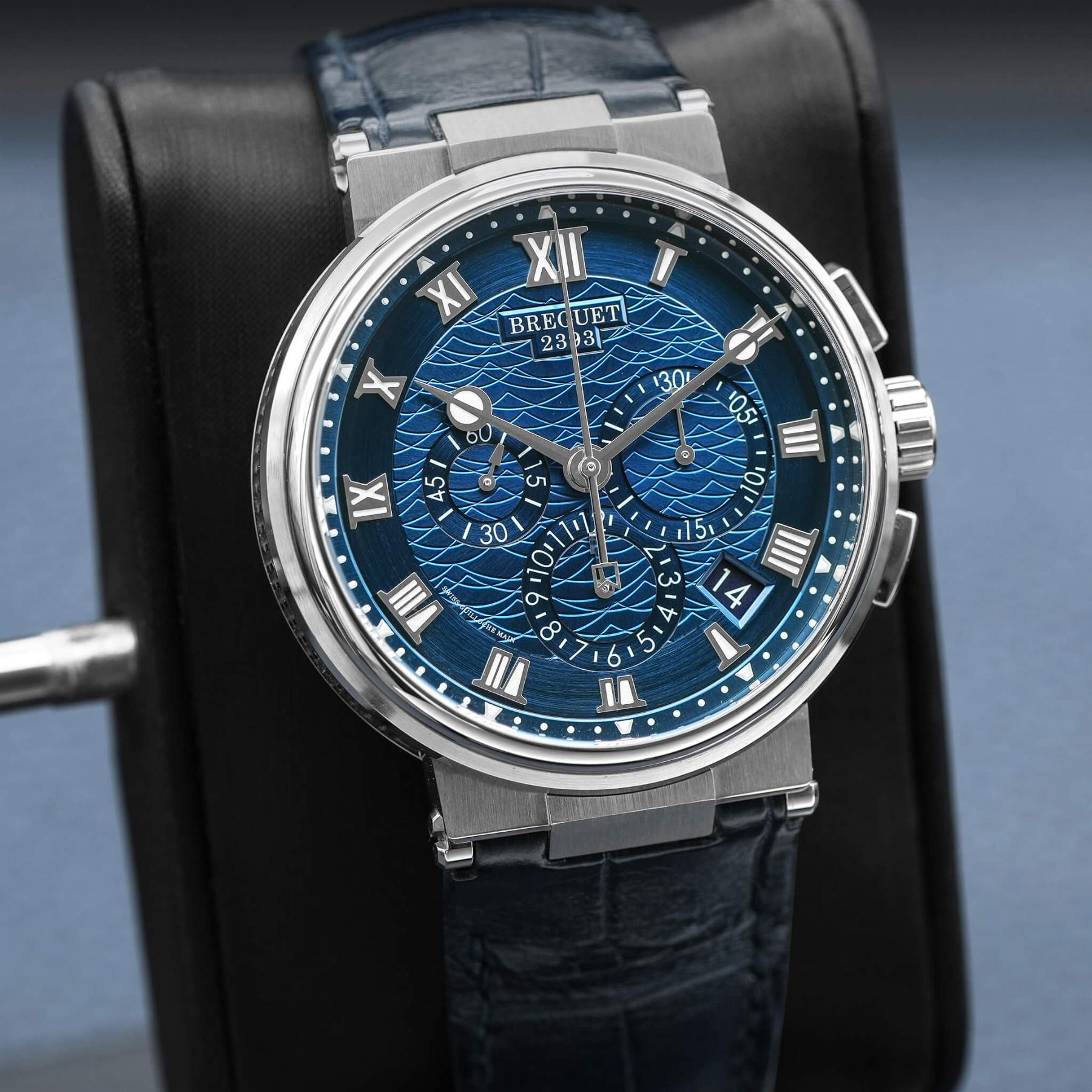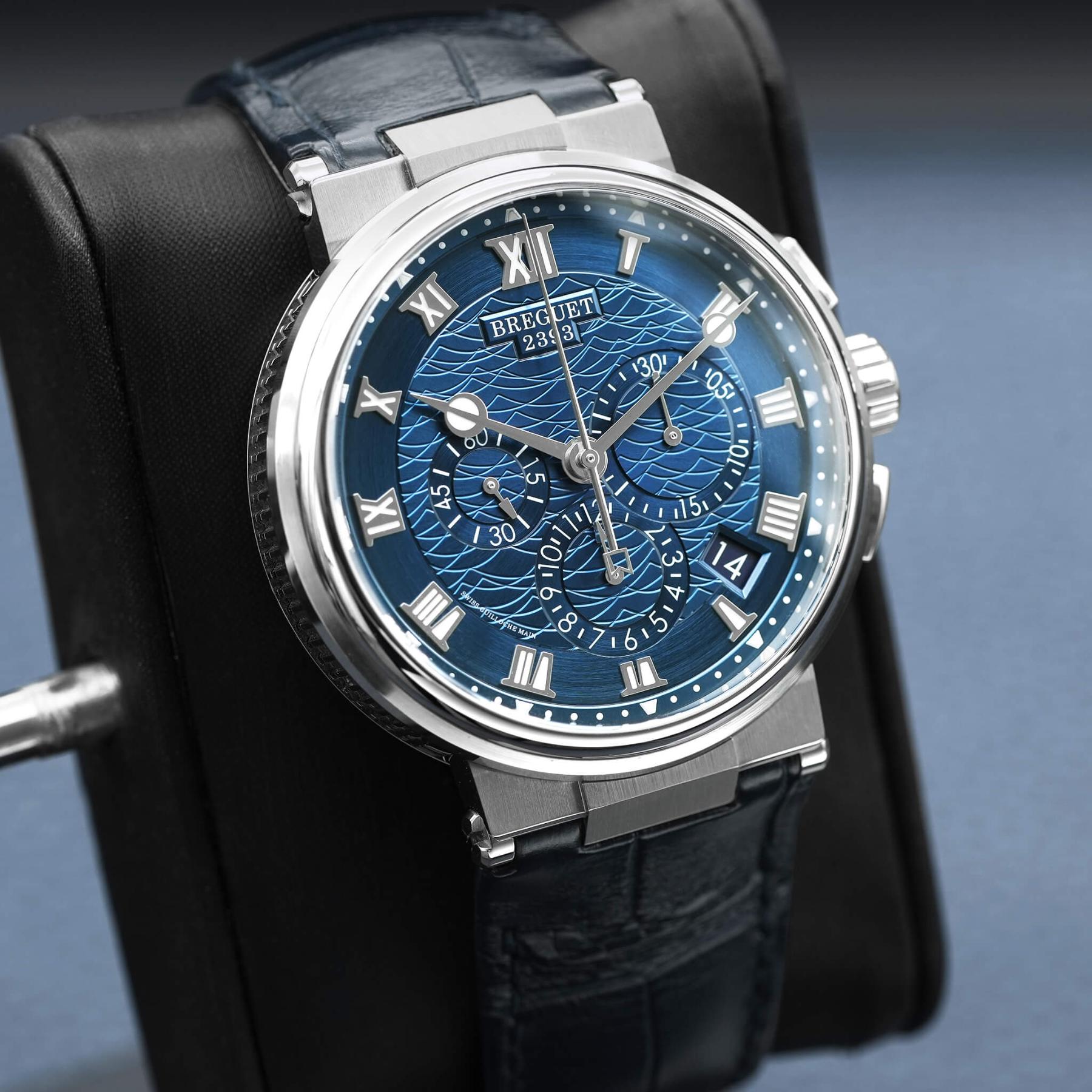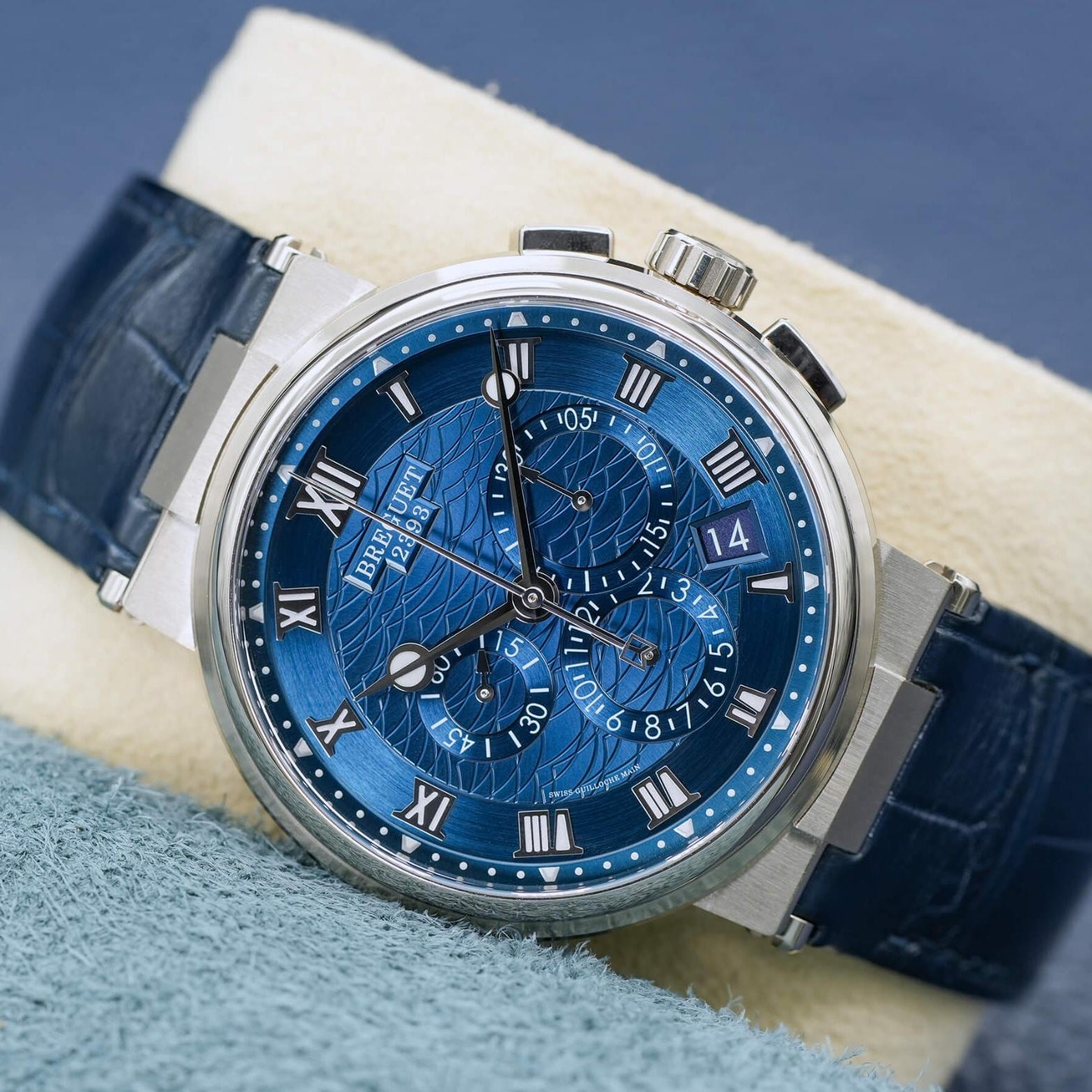 The Breguet Marine Chronographe 42.3mm (Ref. 5527BB/Y2/9WV) is a refined combination of technical excellence and sophisticated design. Crafted in 18k white gold, it features a striking blue guilloché dial with wave motif, a fly-back chronograph, and date display — all powered by the Caliber 582QA automatic movement offering a 48-hour power reserve. With 100 m water resistance and a sapphire case-back showcasing the meticulously finished movement, this watch stands out as both sporty and luxurious. This example, complete with box and papers, is a superb choice for enthusiasts who appreciate Breguet’s heritage in fine watchmaking and maritime-inspired aesthetic.