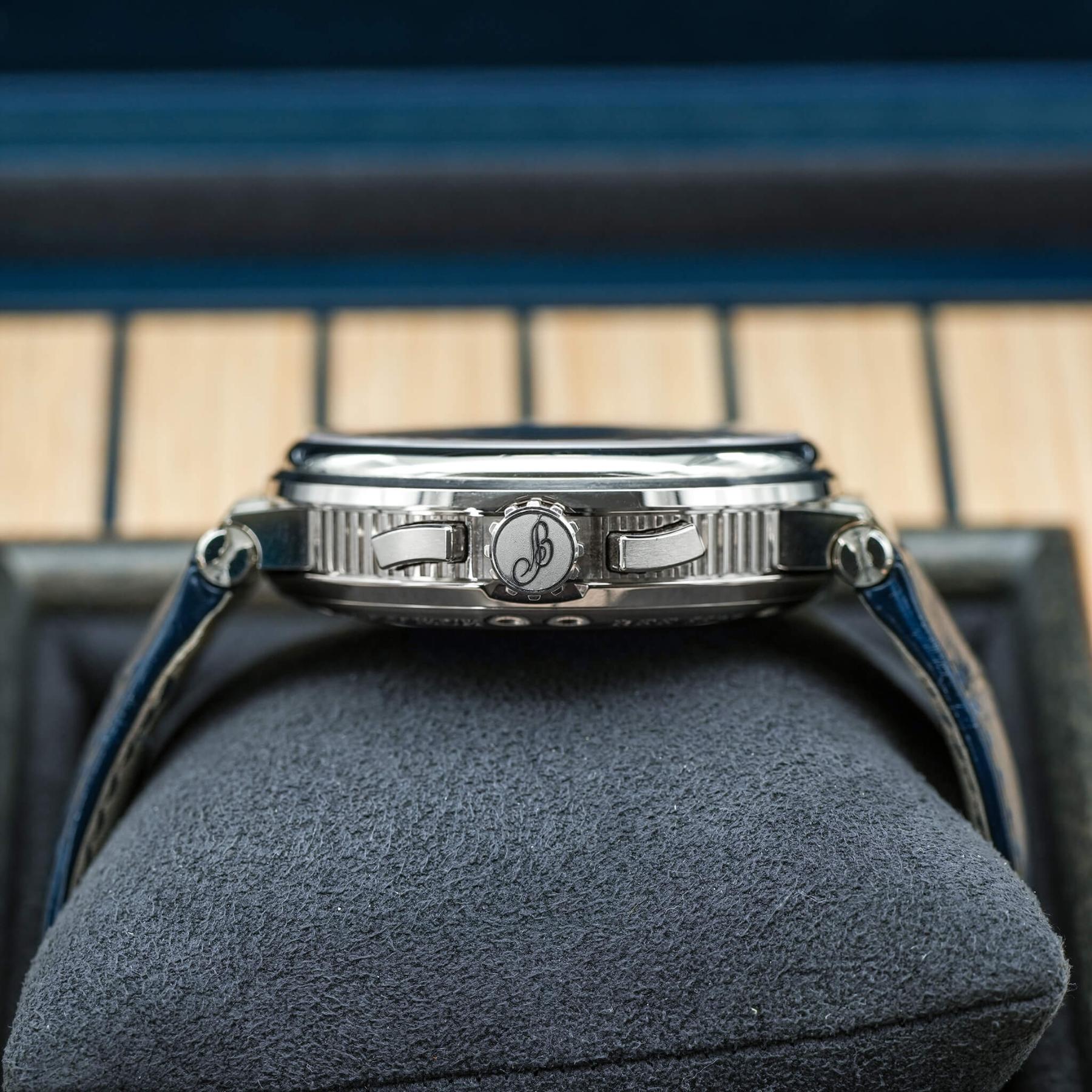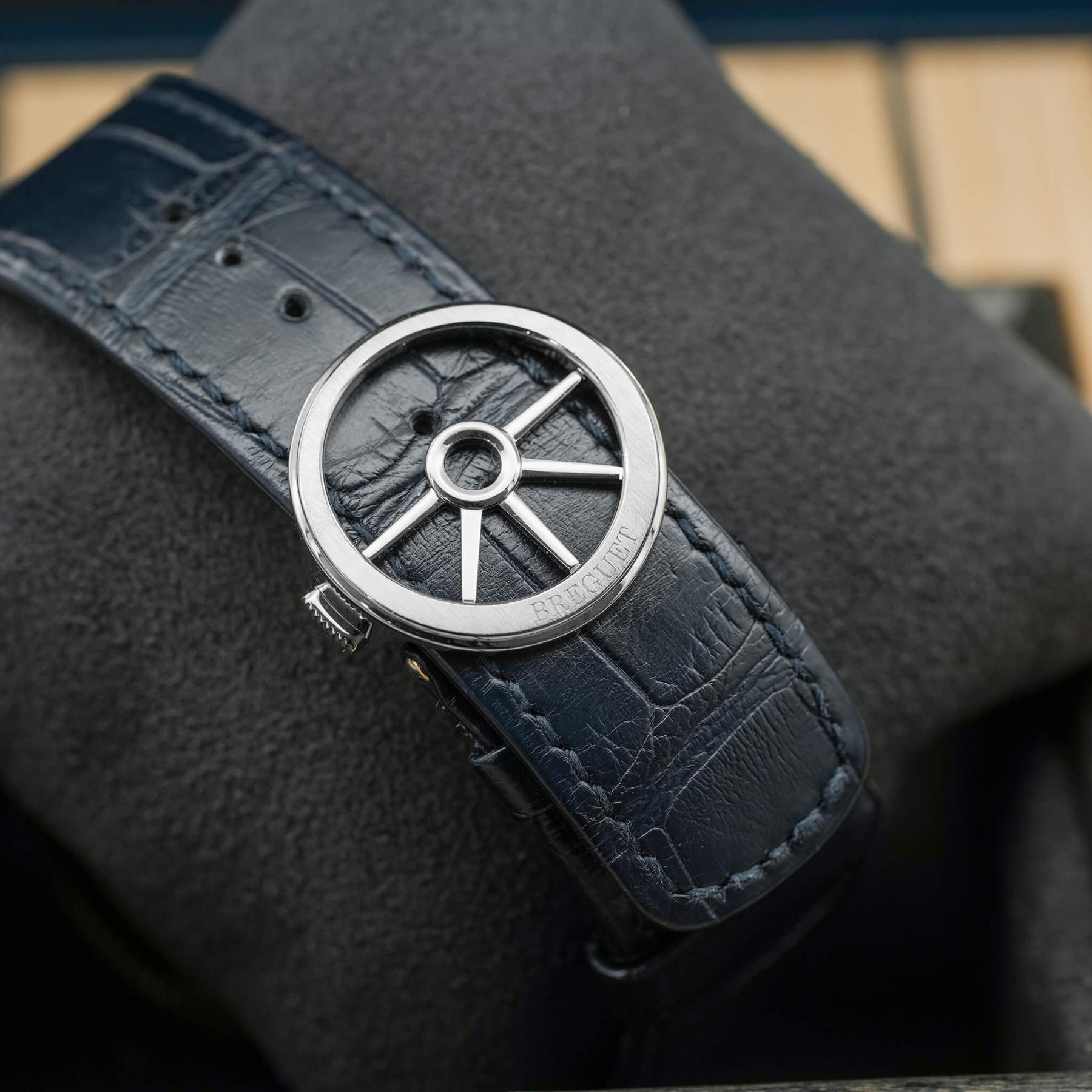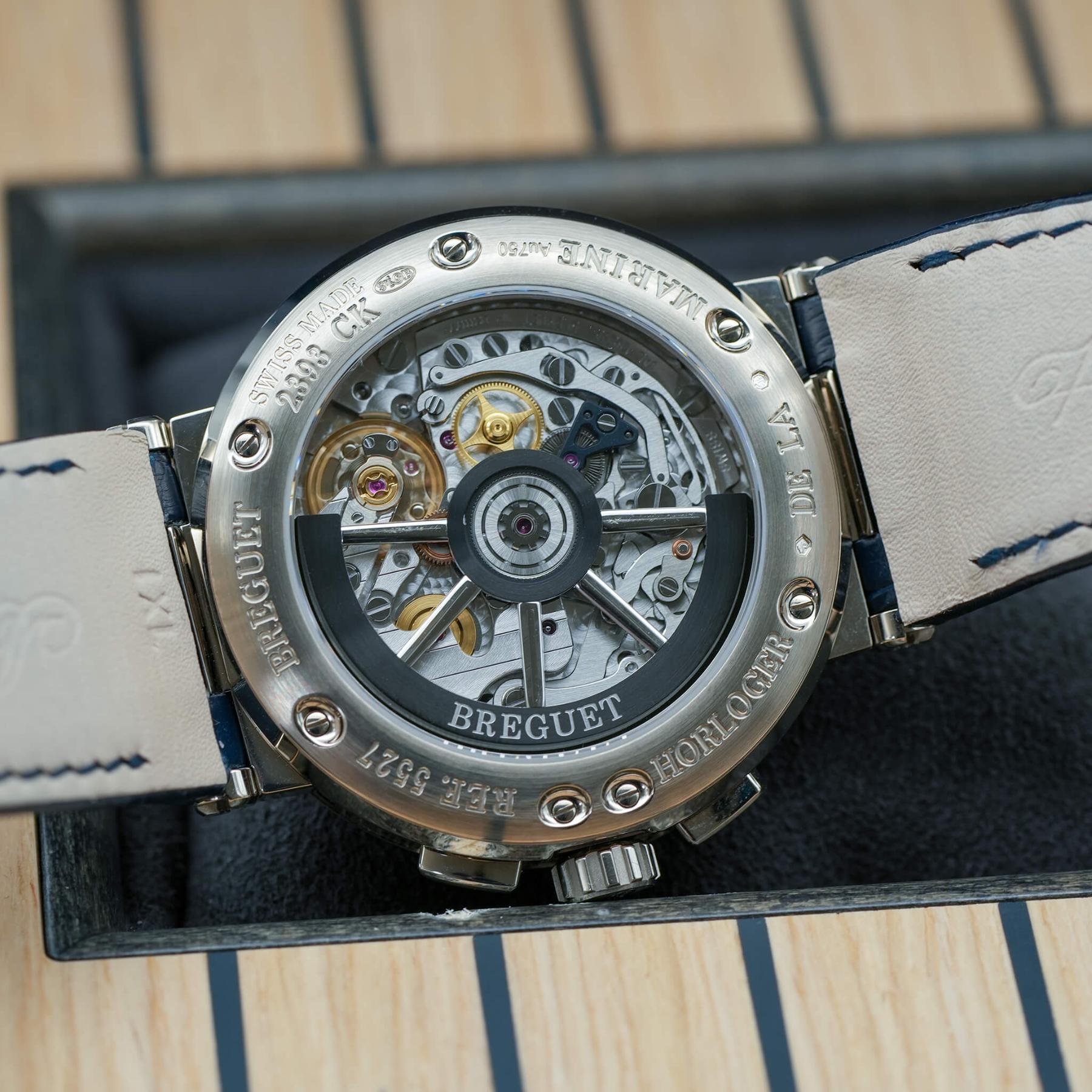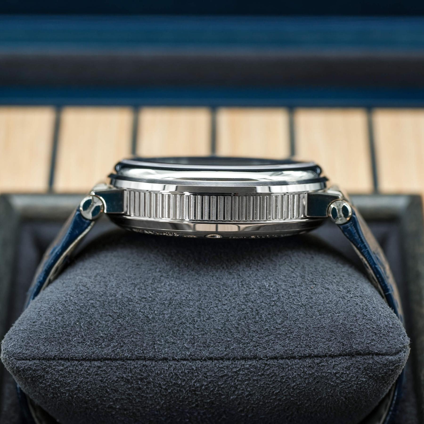The Breguet Marine Chronographe 42.3mm (Ref. 5527BB/Y2/9WV) is a refined combination of technical excellence and sophisticated design. Crafted in 18k white gold, it features a striking blue guilloché dial with wave motif, a fly-back chronograph, and date display — all powered by the Caliber 582QA automatic movement offering a 48-hour power reserve. With 100 m water resistance and a sapphire case-back showcasing the meticulously finished movement, this watch stands out as both sporty and luxurious. This example, complete with box and papers, is a superb choice for enthusiasts who appreciate Breguet’s heritage in fine watchmaking and maritime-inspired aesthetic.