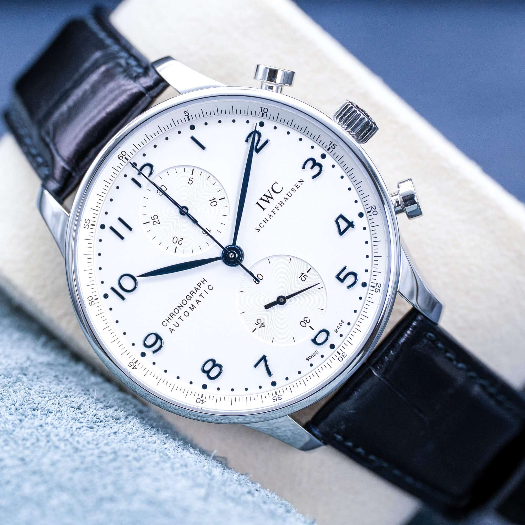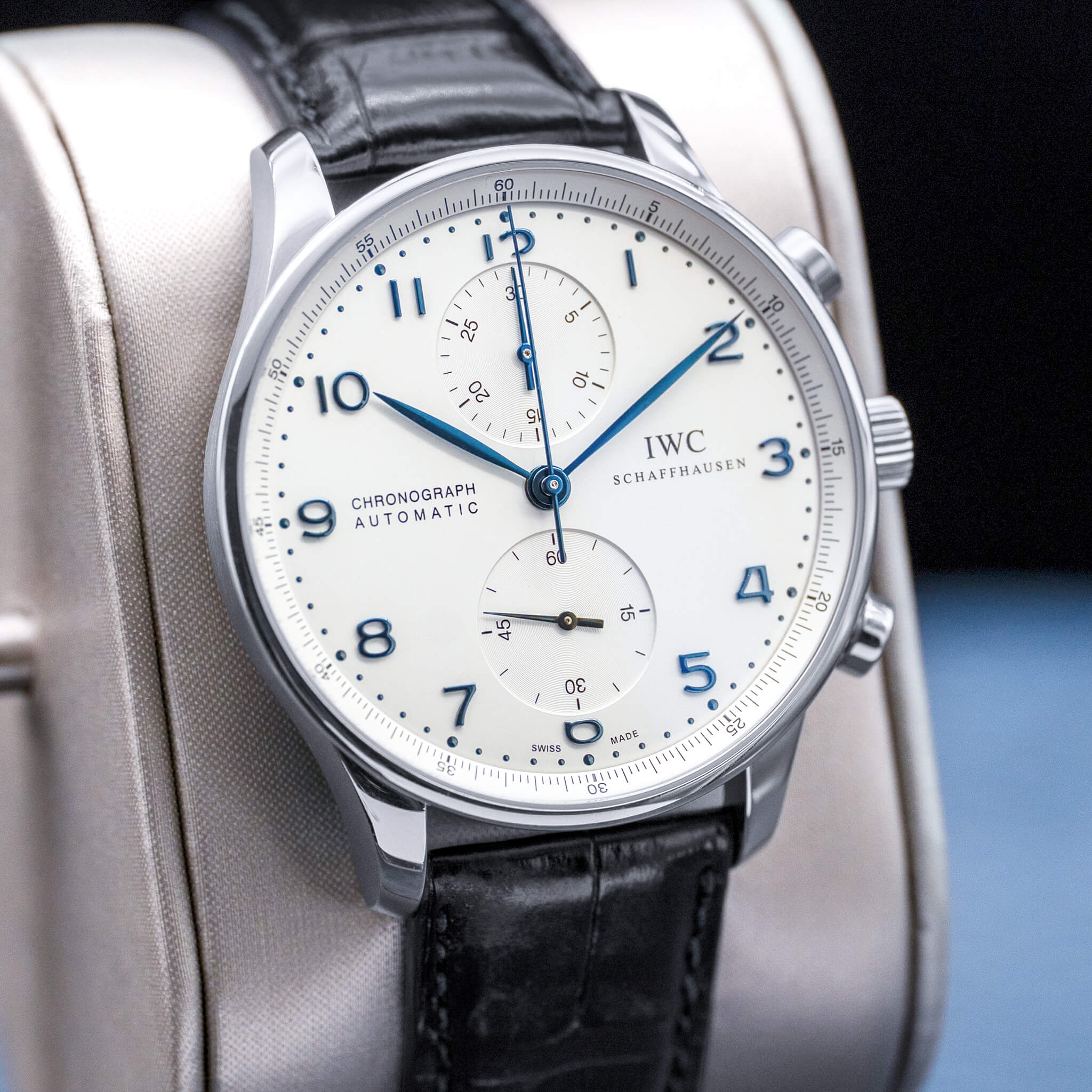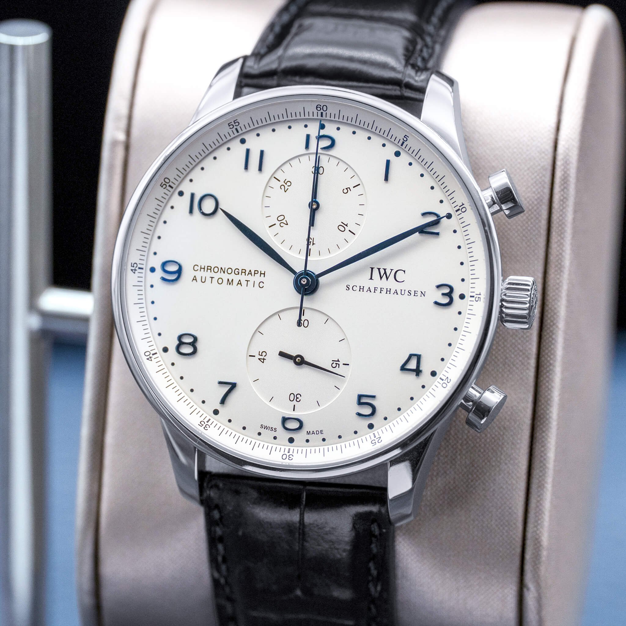 The IWC Portugieser Chronograph 41mm (Ref. IW371446) is a timeless sport-elegant piece, featuring a crisp silver-white dial with contrasting blue subdials and blued hands for elegant readability. Housed in a polished stainless steel case with pump-style chronograph pushers, it’s powered by an automatic IWC 79350 movement, offering a 44-hour power reserve and reliable performance. With a water resistance of 30 meters, it’s built more for dress wear than aquatic adventures. This 2012 model, complete with box and papers, strikes a classic balance between minimal design and horological utility.