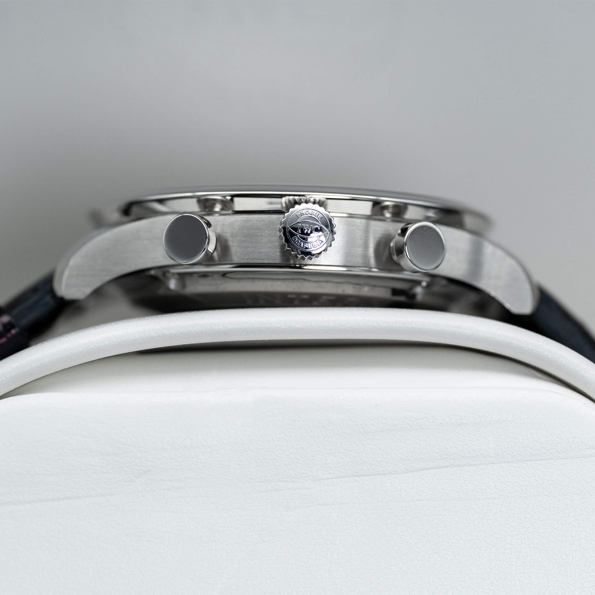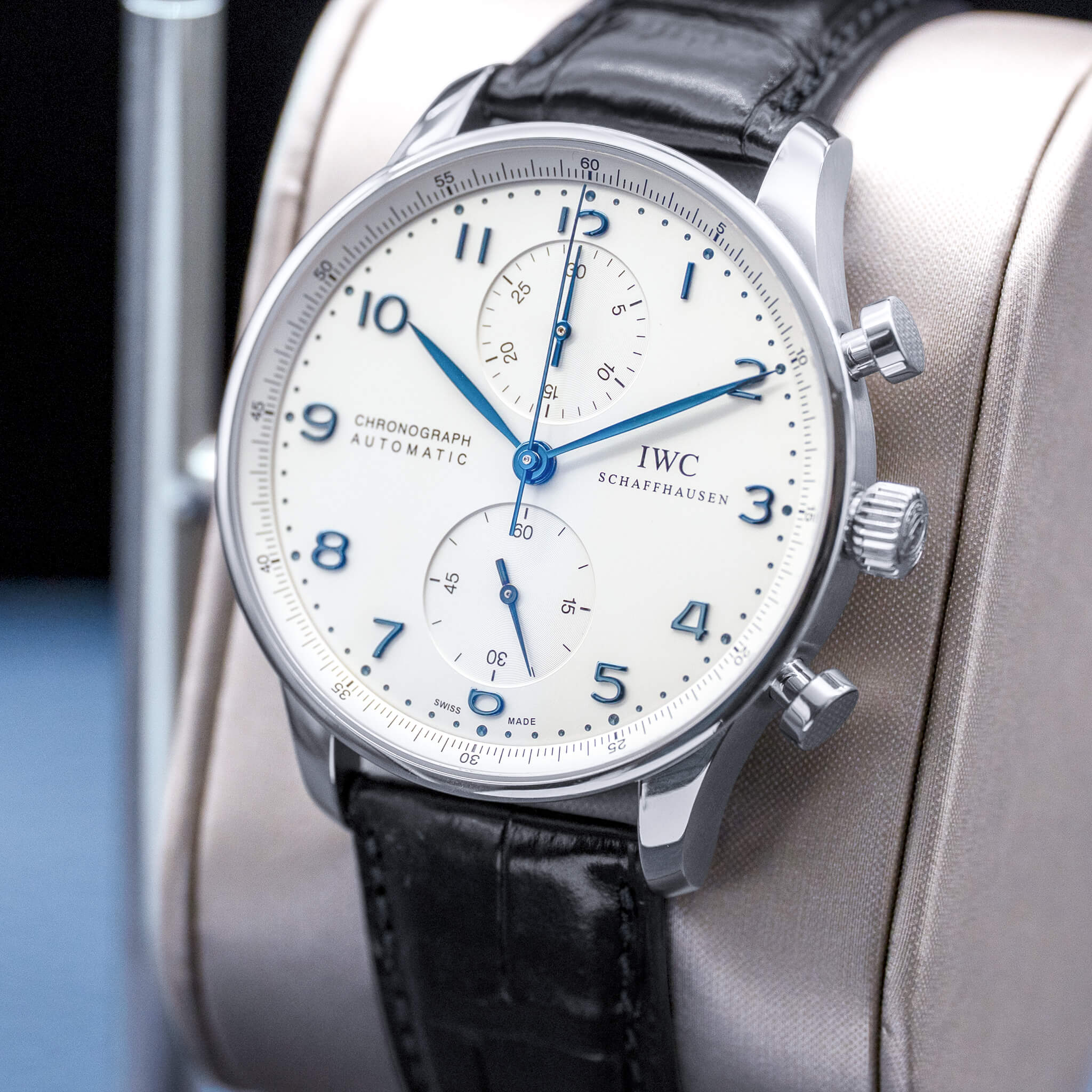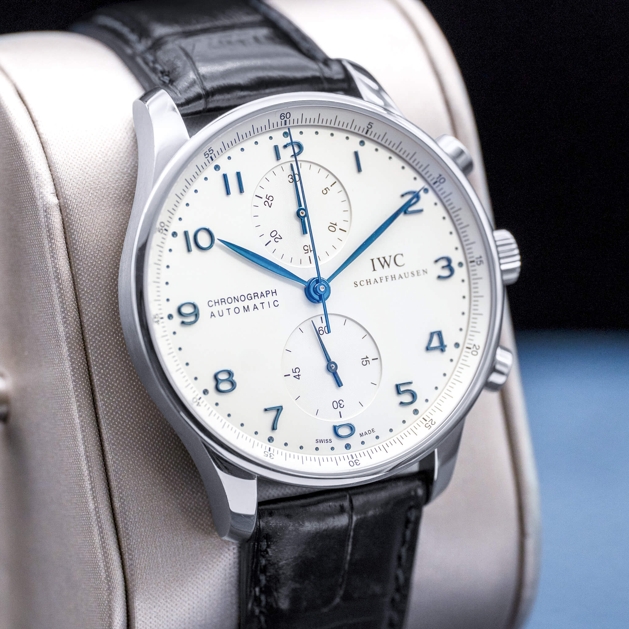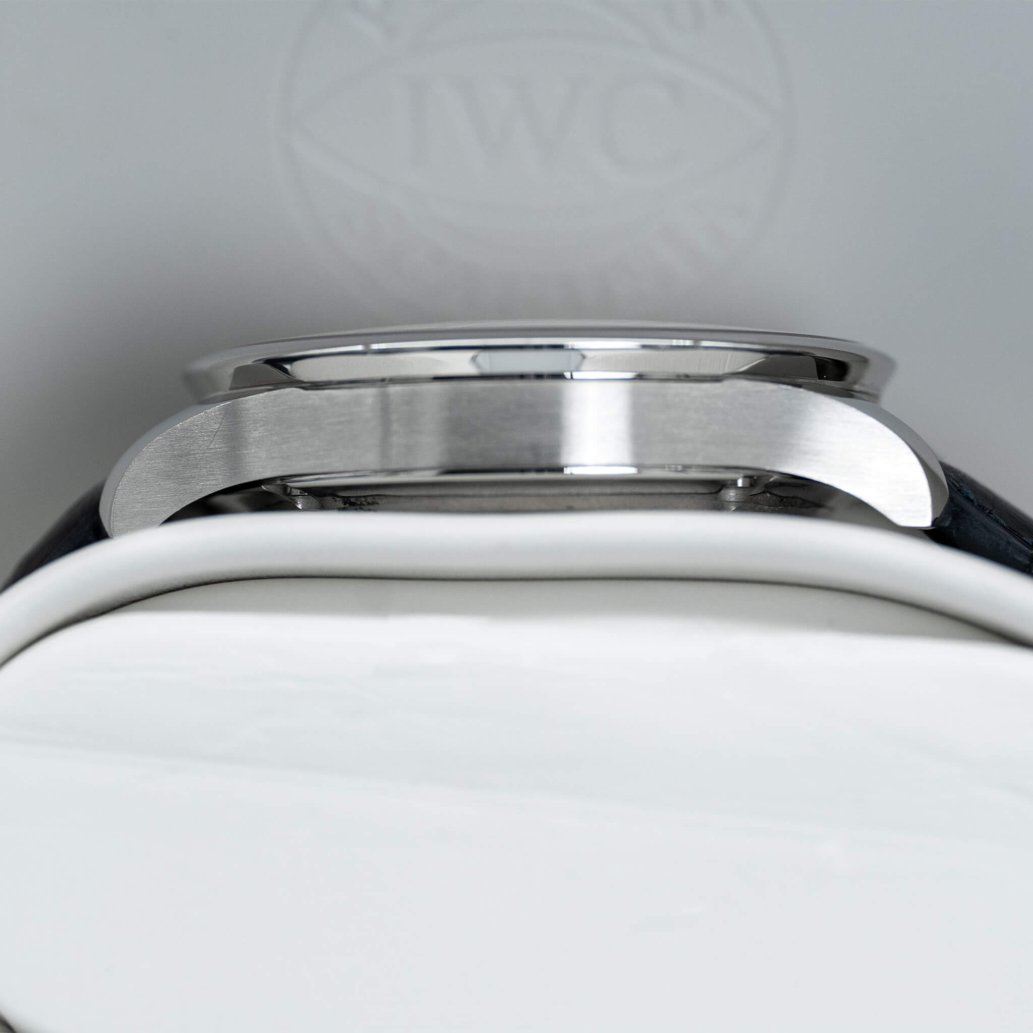 The IWC Portugieser Chronograph 41mm (Ref. IW371446) is a timeless sport-elegant piece, featuring a crisp silver-white dial with contrasting blue subdials and blued hands for elegant readability. Housed in a polished stainless steel case with pump-style chronograph pushers, it’s powered by an automatic IWC 79350 movement, offering a 44-hour power reserve and reliable performance. With a water resistance of 30 meters, it’s built more for dress wear than aquatic adventures. This 2012 model, complete with box and papers, strikes a classic balance between minimal design and horological utility.