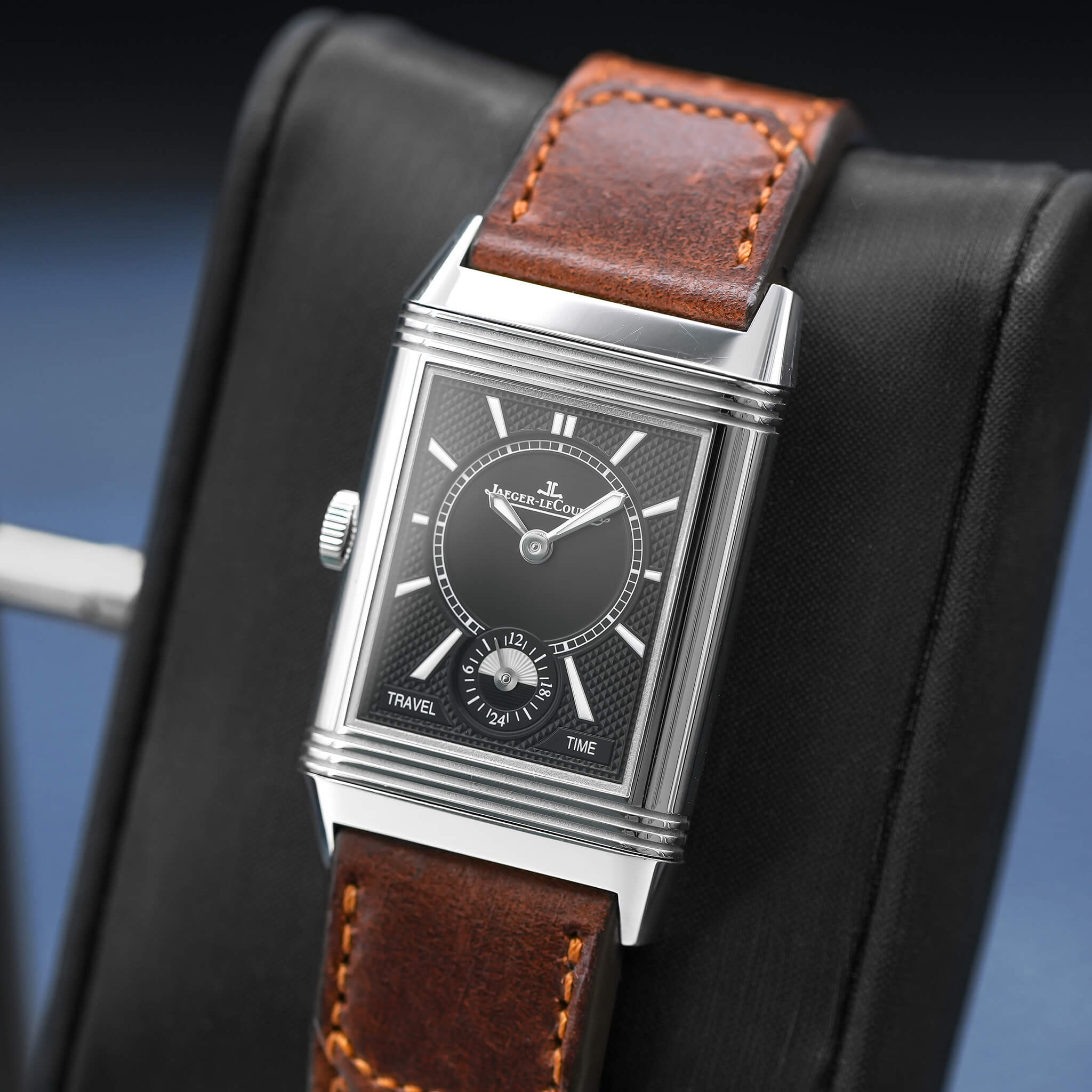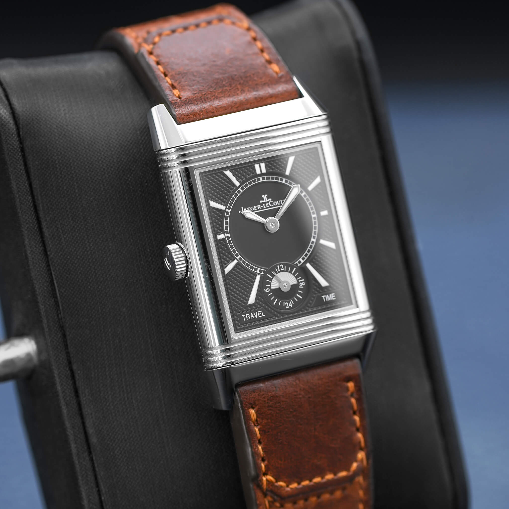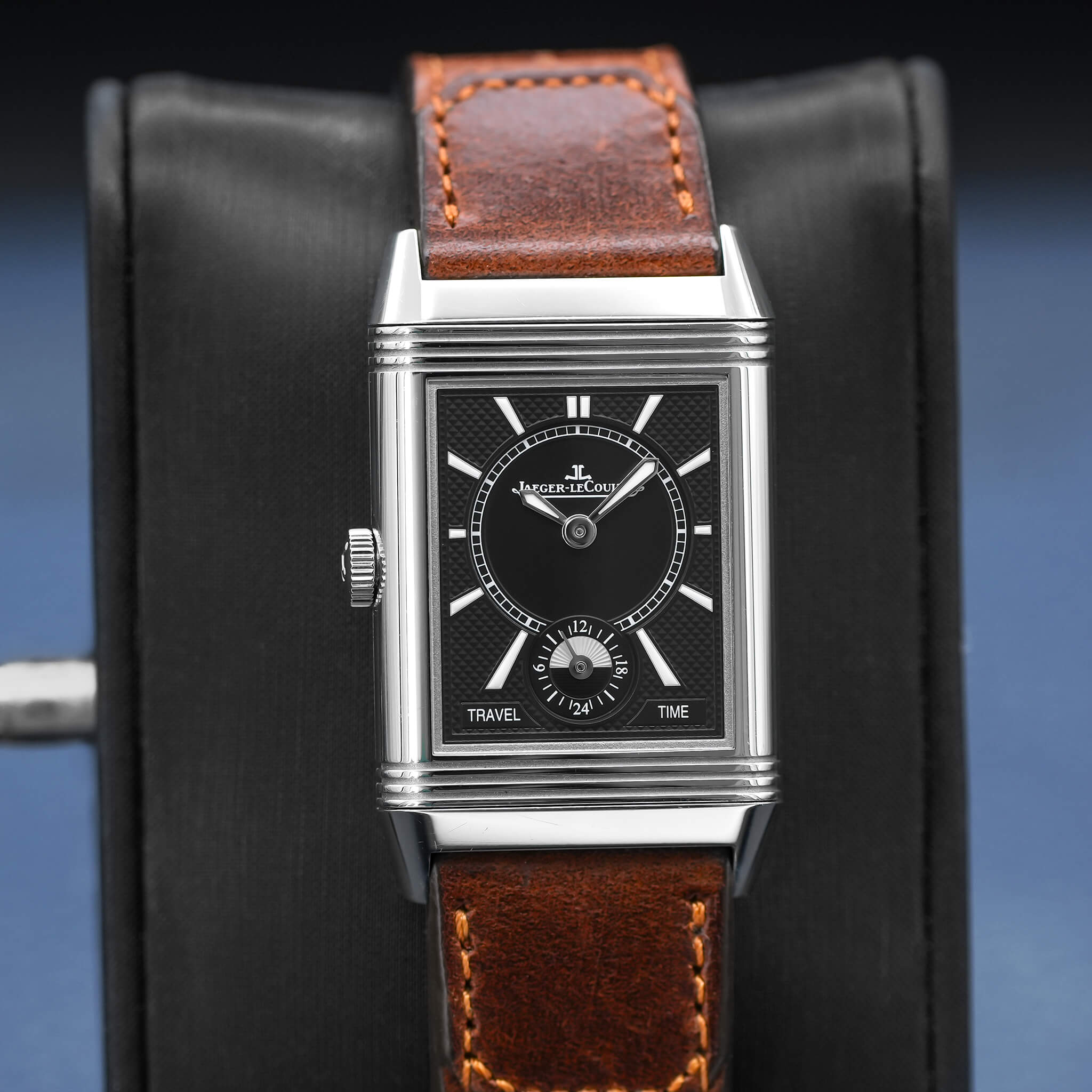 Jaeger-LeCoultre Reverso Classic Duoface Medium “Day/Night” (Ref. Q2458422) is a refined expression of the renowned Reverso lineage, offering two distinct time displays in a single 42.9 × 25.5 mm stainless steel case. The front dial features silvered-grey vertical brushing with Arabic numerals and small seconds, while the reverse dial toggles to a second time zone with a 24-hour day/night indicator set against a black Clous de Paris guilloche backdrop. Powering both displays is the hand-wound Caliber 854, providing 42 hours of power reserve. Rated at just 30 meters water resistance, this watch prioritizes elegance and functionality over sport utility. This medium-sized model, complete with box and papers, embodies Jaeger-LeCoultre’s iconic blend of art-deco design, technical excellence, and everyday versatility.