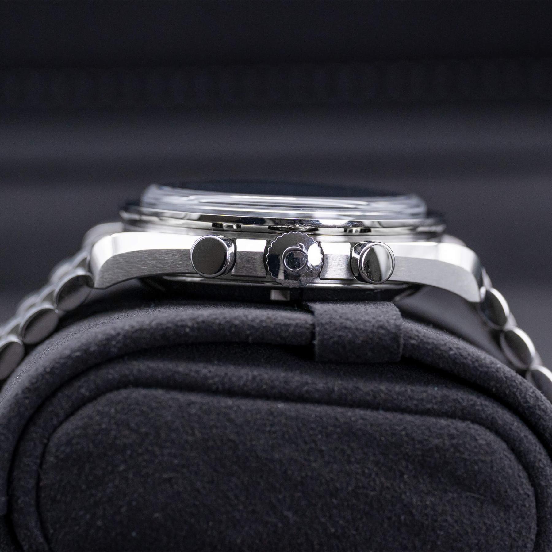 The Omega Speedmaster “Sapphire Sandwich” Moonwatch 42mm is a modern interpretation of one of the most iconic chronographs in watchmaking history, combining the classic Speedmaster design with contemporary finishing and materials. Featuring a crisp black dial with the signature tri-compax layout and a sapphire crystal front and display caseback (hence “Sapphire Sandwich”), this reference showcases both the heritage and the heart of the movement. Powered by Omega’s Co-Axial Master Chronometer Caliber 3861, it delivers exceptional precision, magnetic resistance, and a robust power reserve—all hallmarks of the latest Moonwatch generation. The balanced 42mm case wears true to the Speedmaster’s legacy while offering everyday versatility, making it ideal for collectors and enthusiasts alike. This 2025 example, complete with box and papers, is an outstanding opportunity to own a current-production Moonwatch that pairs storied history with modern performance and finishing.