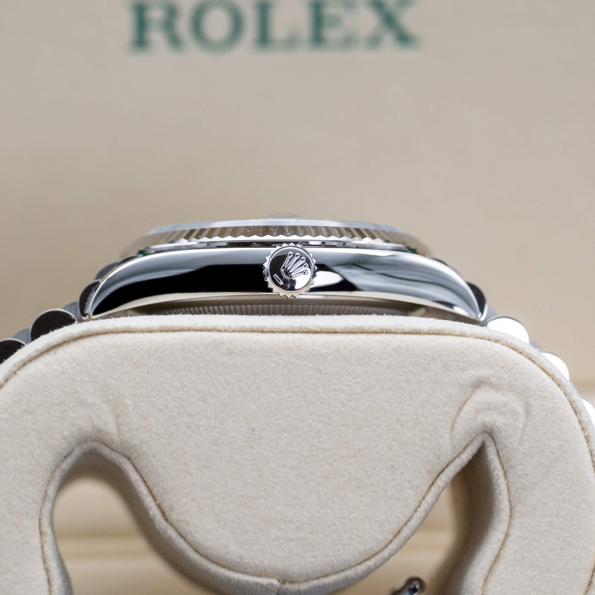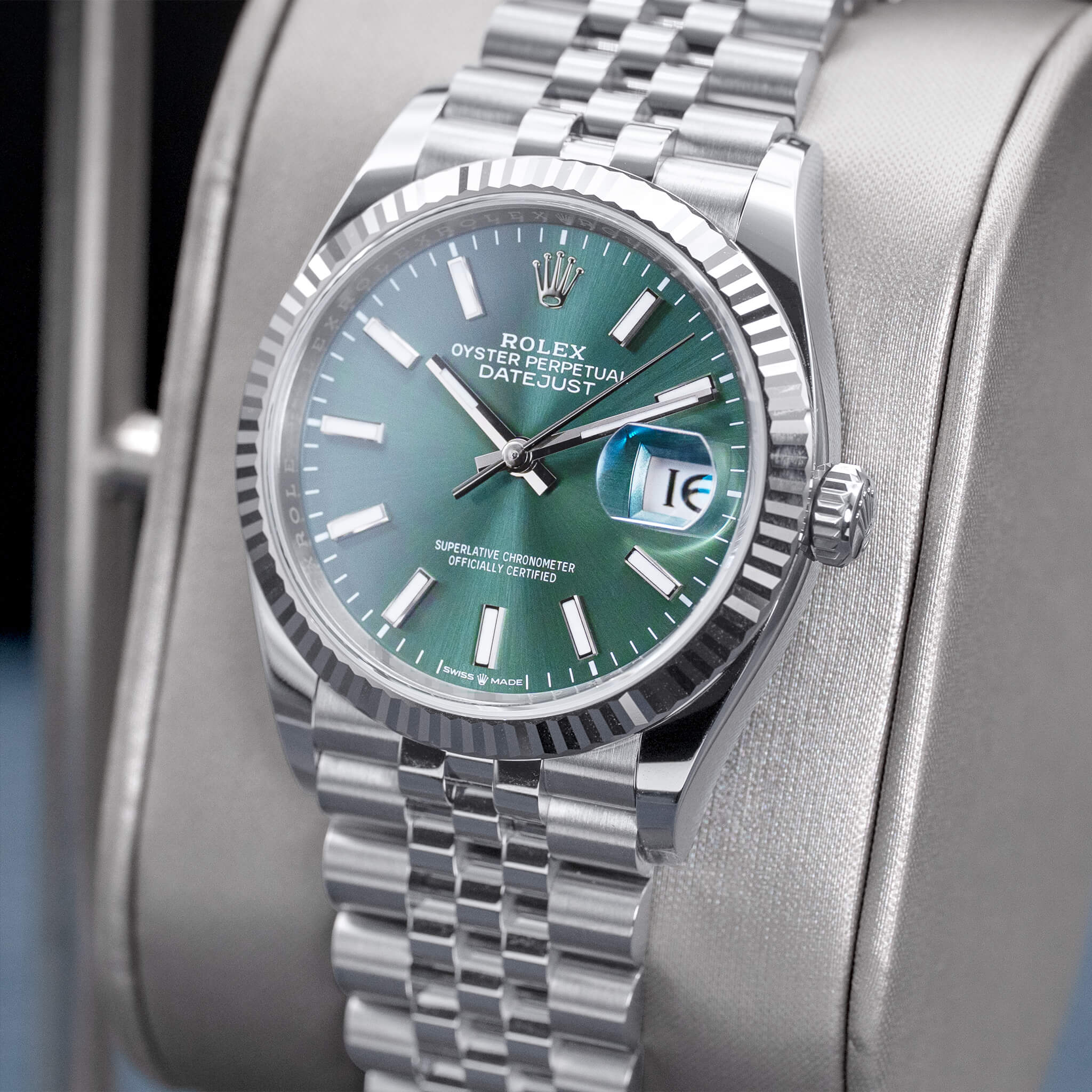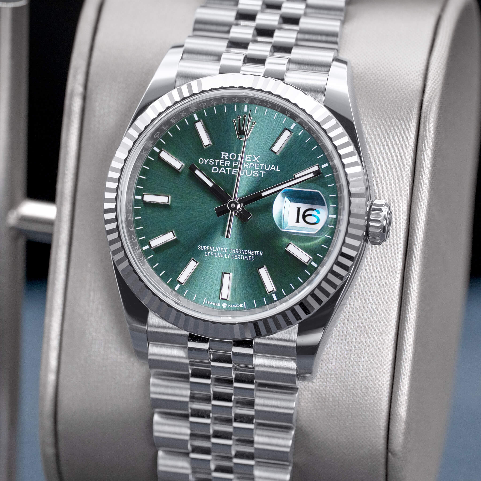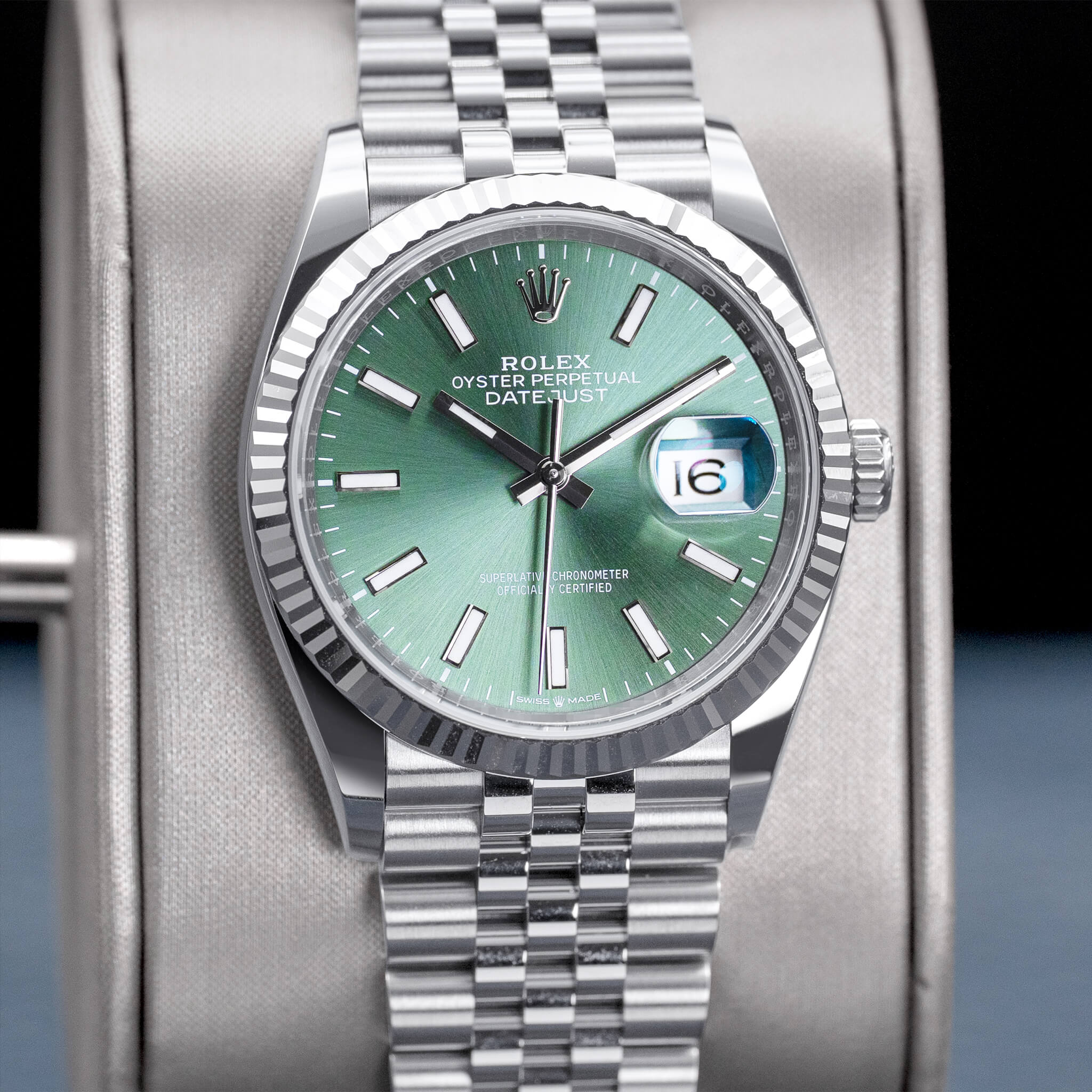The Rolex Datejust 36 mm (Ref. 126234) with a striking green sunburst dial, fluted white-gold bezel, and Jubilee bracelet is a vibrant blend of heritage and contemporary style. Crafted from Oystersteel and 18k white gold, it features a refined case size perfect for many wrists. Powered by the Caliber 3235, this timepiece offers chronometer-certified accuracy and a 70-hour power reserve, ensuring reliability and performance. This 2025 new/unworn example, complete with box and papers, is a standout in the Datejust collection—celebrated for its fresh dial color, timeless design, and enduring Rolex appeal.
