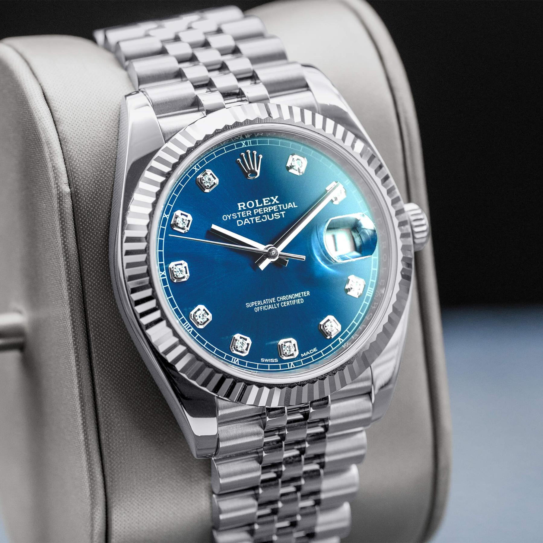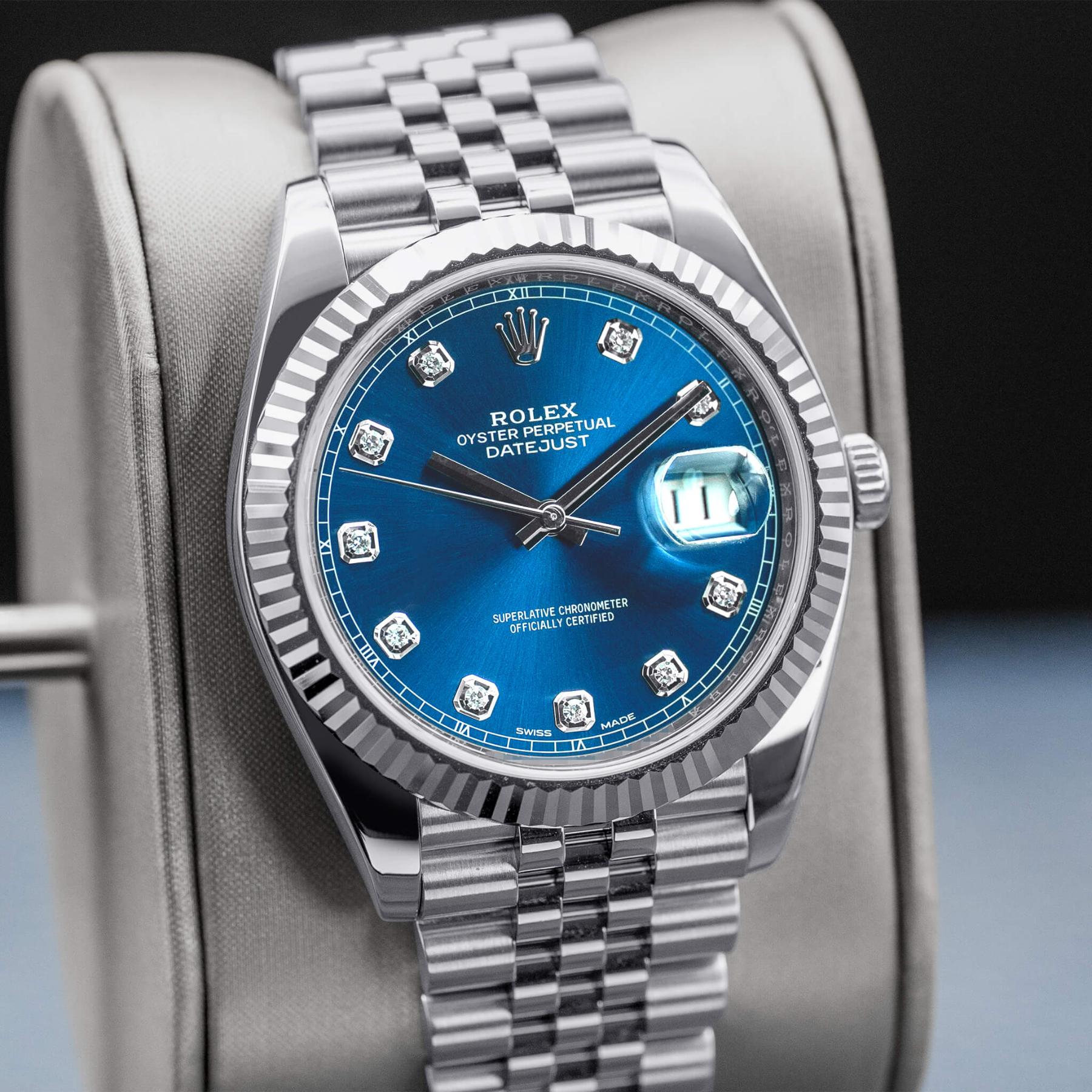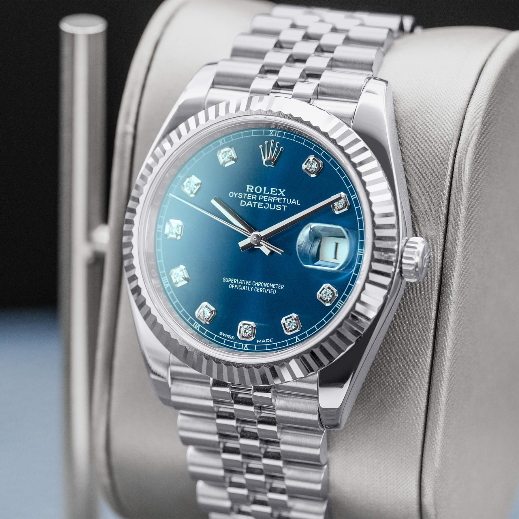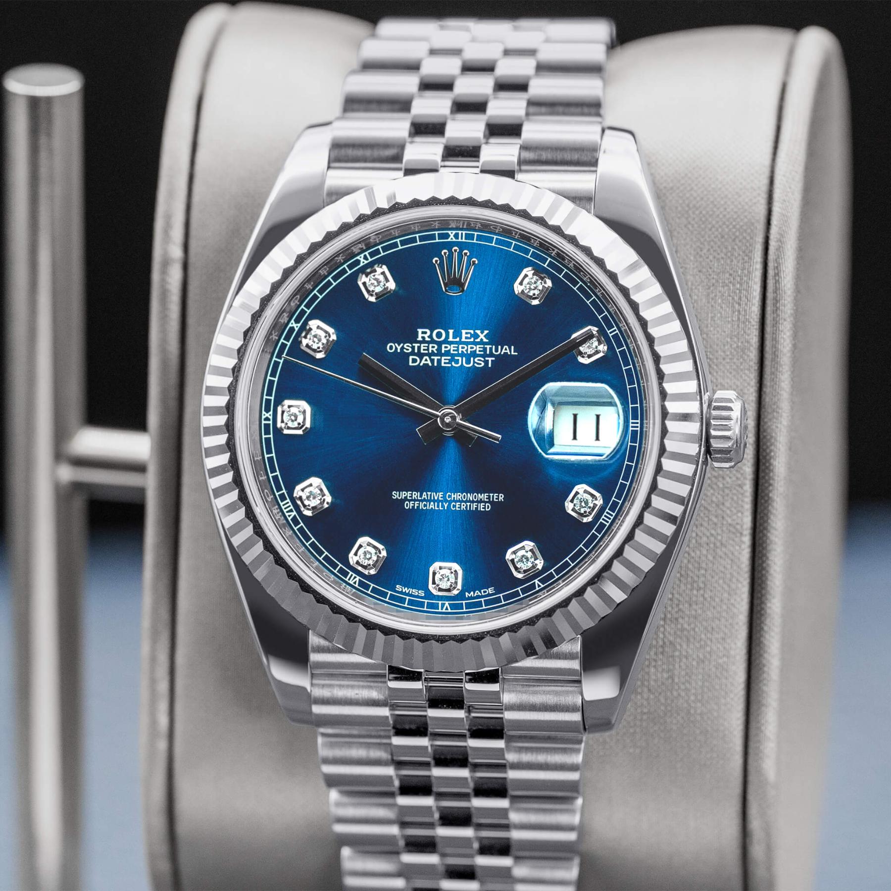 The Rolex Datejust 41mm (Ref. 126334) is a refined expression of Rolex’s most iconic dress-sport model, featuring a striking blue dial accentuated by diamond hour markers and framed by the classic fluted white-gold bezel that defines the modern Datejust aesthetic. Powered by the reliable Caliber 3235, it delivers excellent accuracy, an extended power reserve, and smooth performance while maintaining effortless everyday wearability. The 41mm Oyster case balances presence with versatility, making it equally suited for formal occasions and daily wear, while the Jubilee bracelet adds a touch of sophistication and comfort. This 2012 example, complete with box and papers, is an excellent opportunity to add a timeless and collectible Datejust 41 to the collection—one that combines understated luxury with enduring Rolex style.