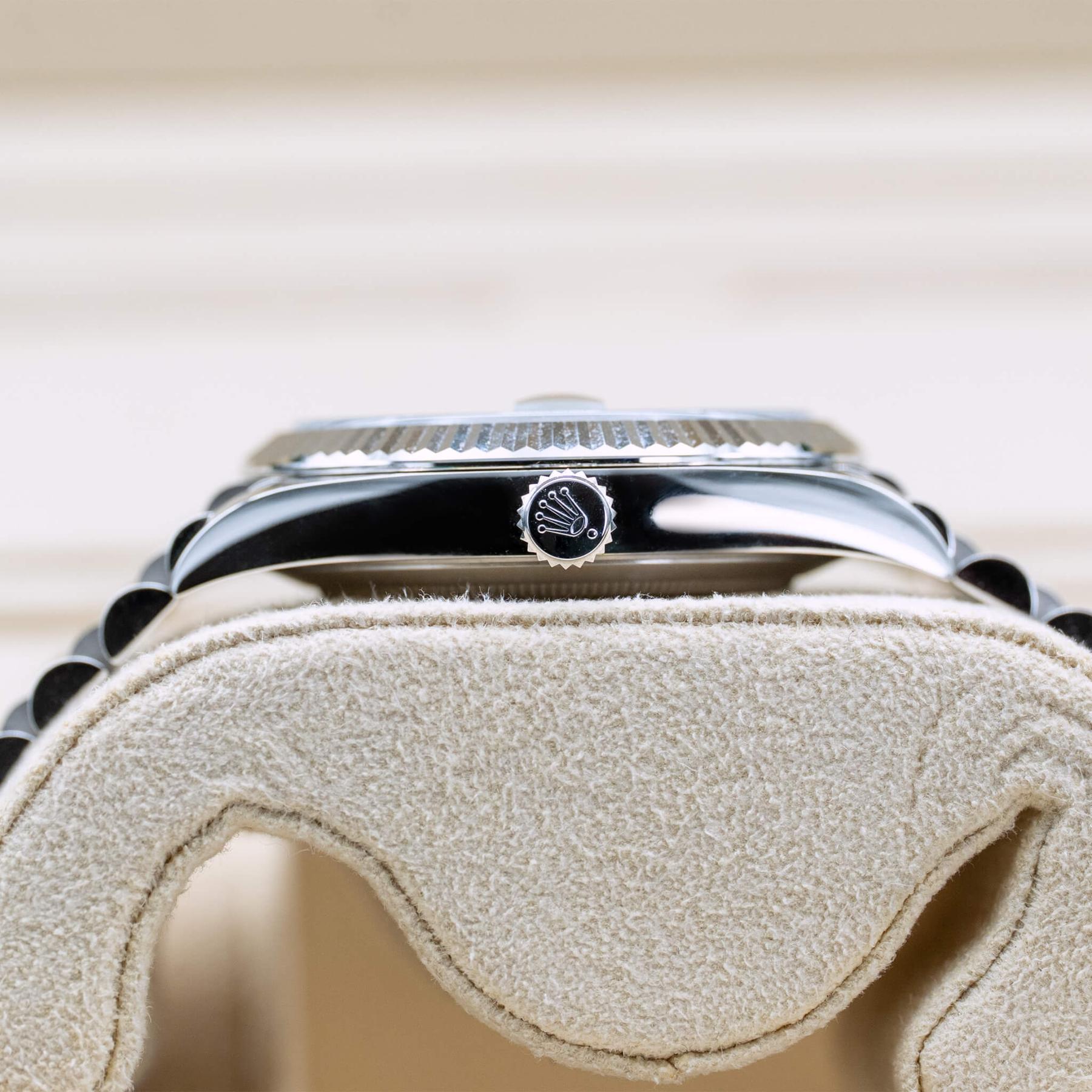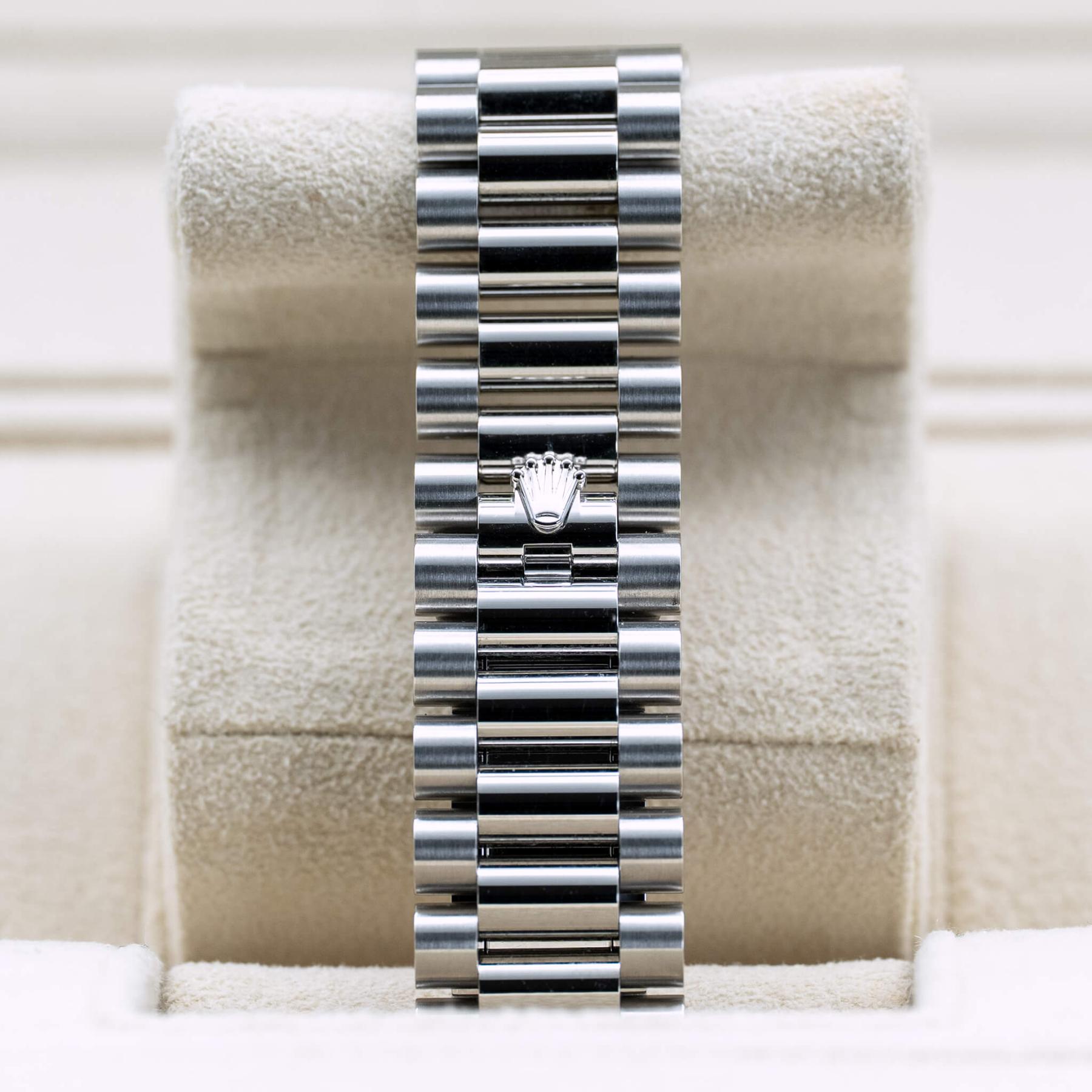 The Rolex Day-Date 40mm (Ref. 228236) in platinum with the iconic ice blue dial is one of the most prestigious and unmistakable expressions of Rolex’s flagship model. Celebrated for its refined presence and symbolic status, the Day-Date combines Rolex’s signature President bracelet with the highest tier of materials and finishing—including a solid platinum case and bracelet that give it an impressive weight and luxurious feel on the wrist. Powered by the in-house Caliber 3255, it offers outstanding accuracy, reliability, and an improved power reserve, while the clean yet striking ice blue dial adds a distinctive and sophisticated aesthetic that complements the watch’s refined proportions. This 2025 example, brand new with box and papers, is an exceptional opportunity to acquire one of Rolex’s most elite references—an iconic timepiece with enduring prestige and strong long-term desirability.