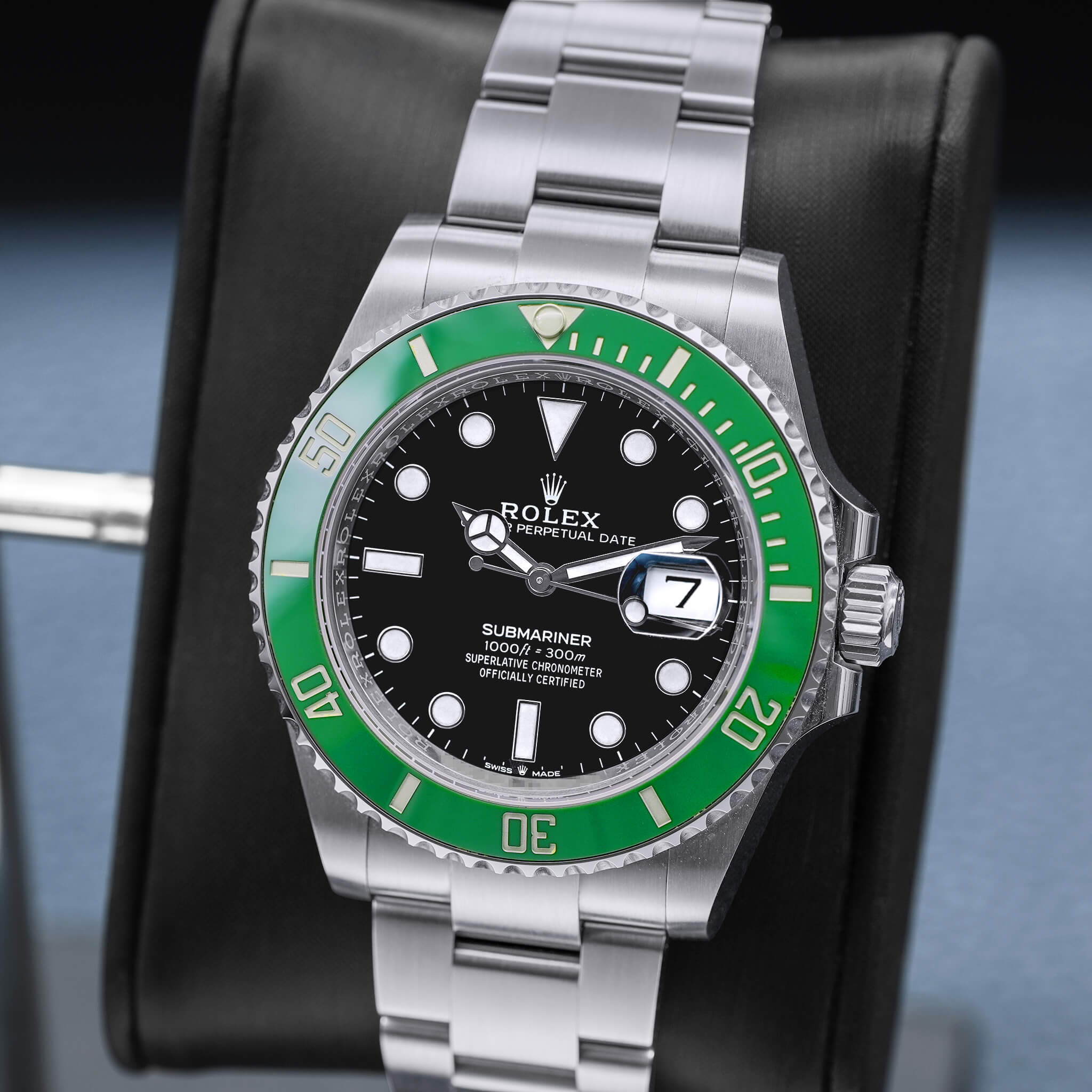 The Rolex Submariner “Starbucks” 40mm (Ref. 126610LV) is a modern icon, distinguished by its bold green Cerachrom bezel paired with a classic black dial, creating a striking two-tone contrast. Crafted from Oystersteel, the 40mm case is complemented by the robust Oyster bracelet with Glidelock extension, offering both comfort and ruggedness. Equipped with the Caliber 3235, this timepiece delivers chronometer-certified precision, a 70-hour power reserve, and 300m water resistance, making it ideal for both underwater adventures and daily wear. This 2023 example, complete with box and papers, is a fiercely desired Submariner for collectors who appreciate Rolex’s blend of bold aesthetics and unrivaled engineering.