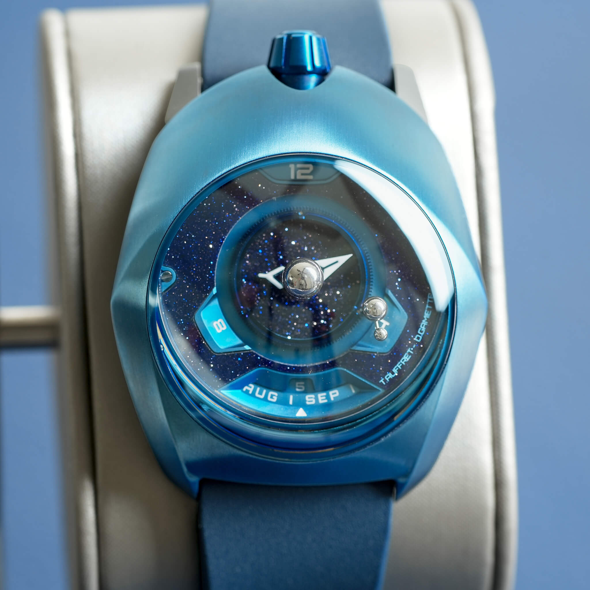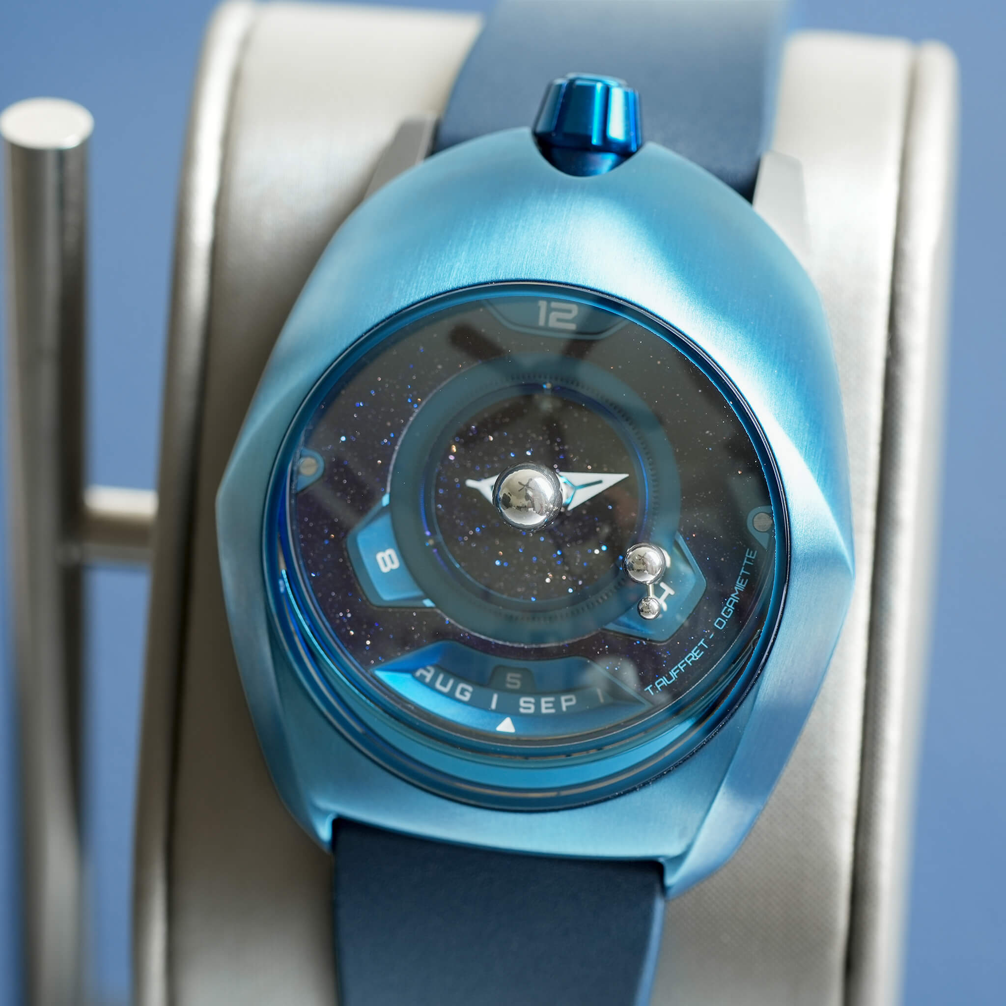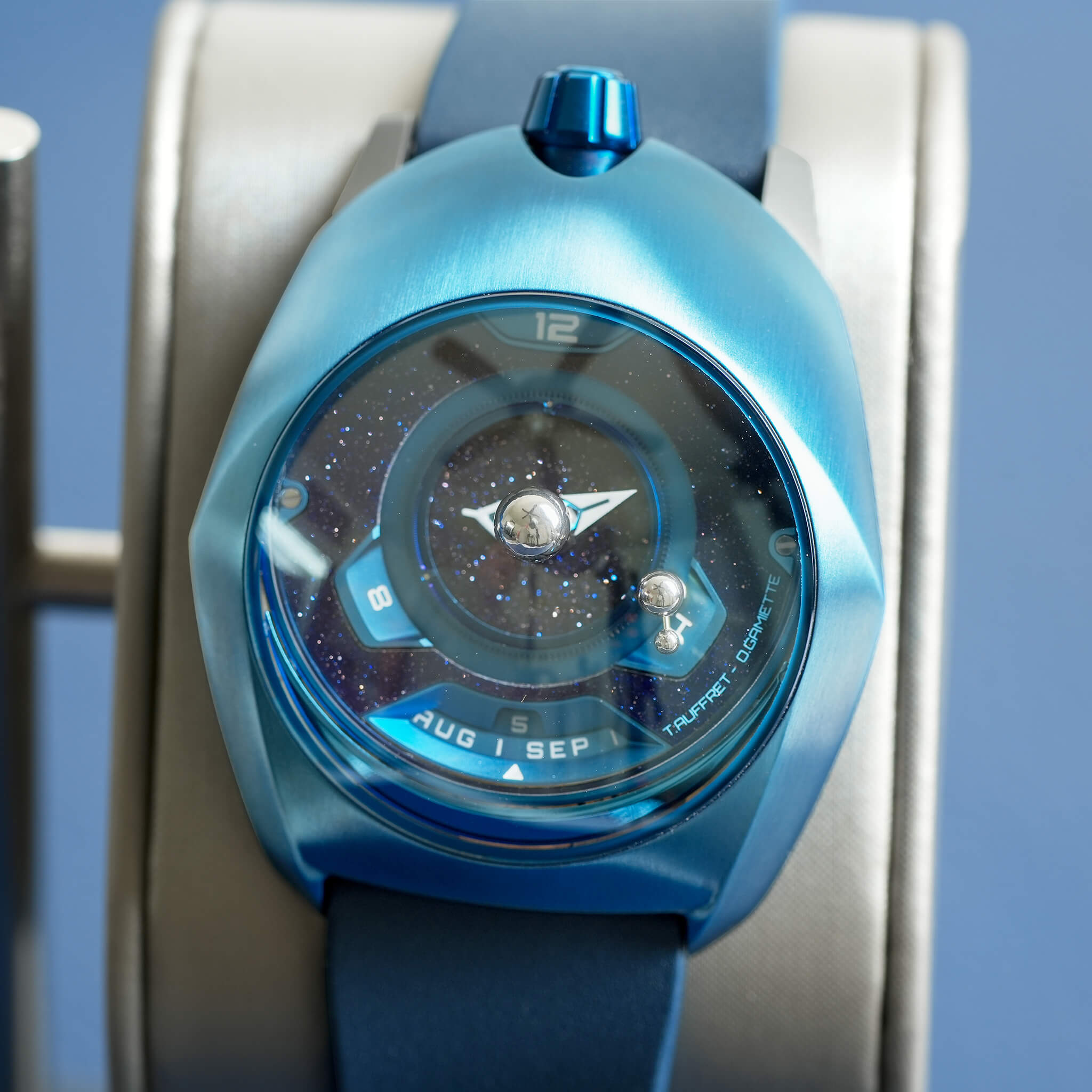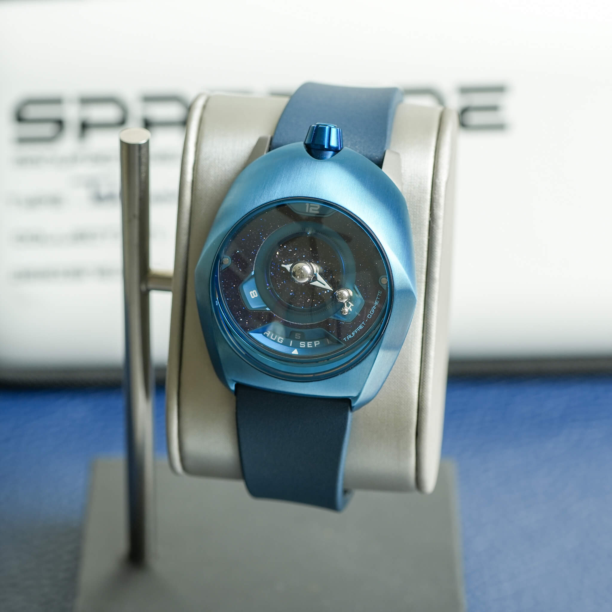 The SpaceOne Tellurium 42mm Titanium (2024) is a visionary interpretation of astronomical mechanics, blending sleek design with celestial complications via the patented Tellurium module. Crafted in grade-5 titanium and featuring a domed sapphire crystal over an aventurine dial, it houses a Soprod P024 automatic movement married to a heliocentric display of Earth, Moon, and Sun, along with calendar functions. The case defies conventional geometry — smooth, curved, and “pebble-like” in profile — while maintaining a bold presence. Rated to 40m water resistance, this 2024 model, complete with box and papers, stands as a compelling piece of modern watchmaking built between France and Switzerland.