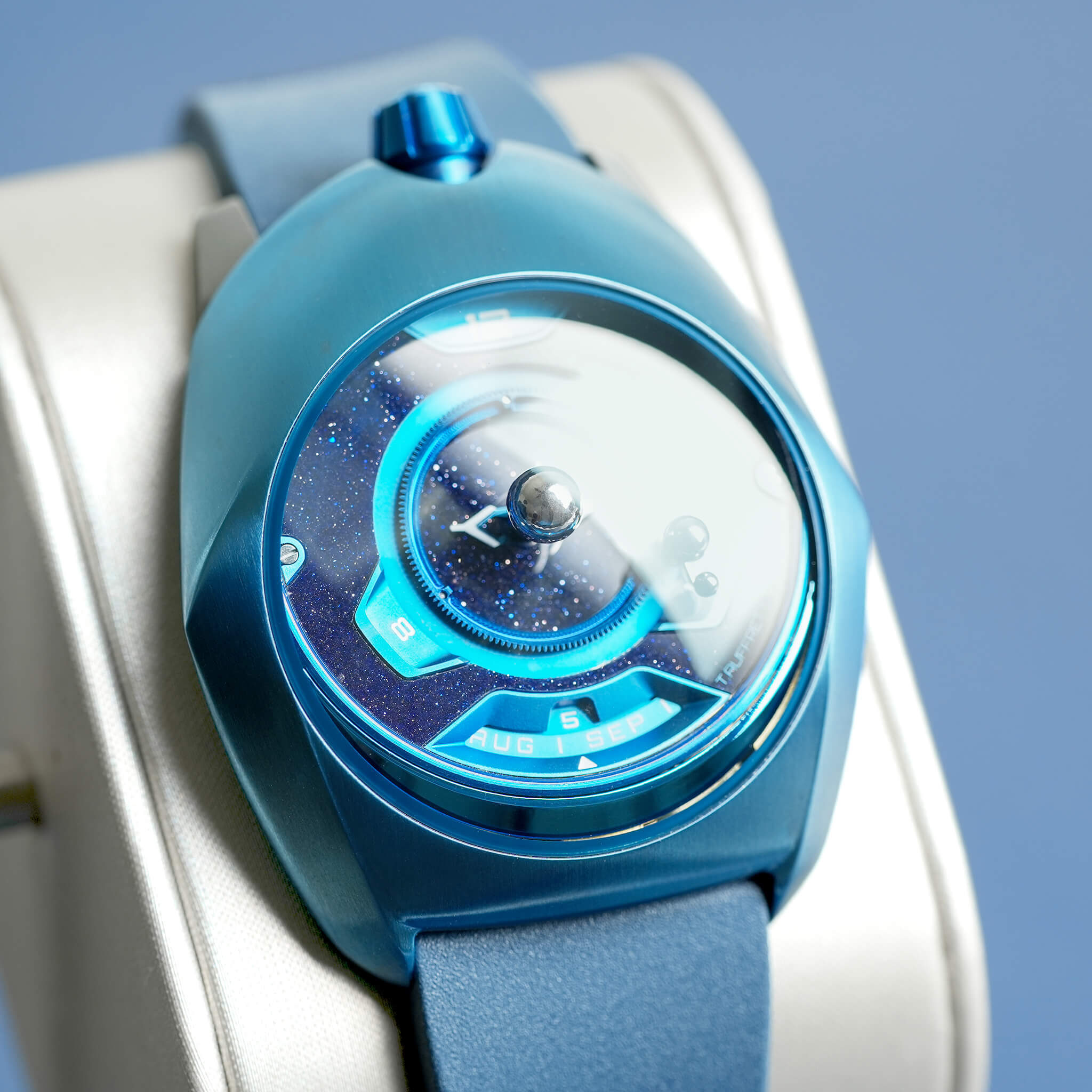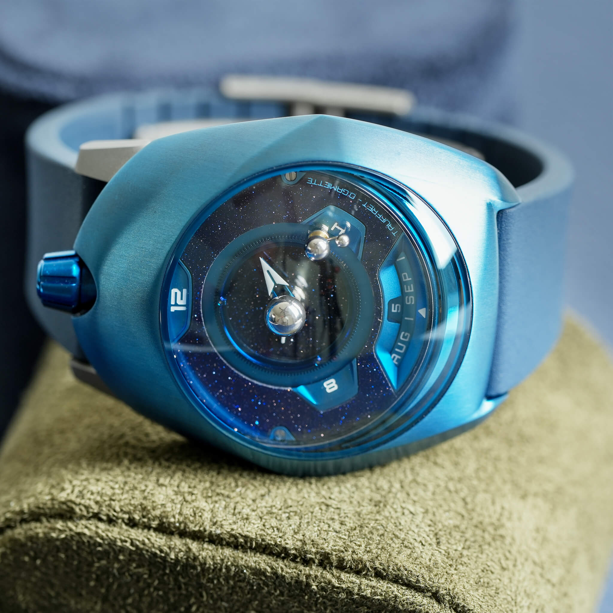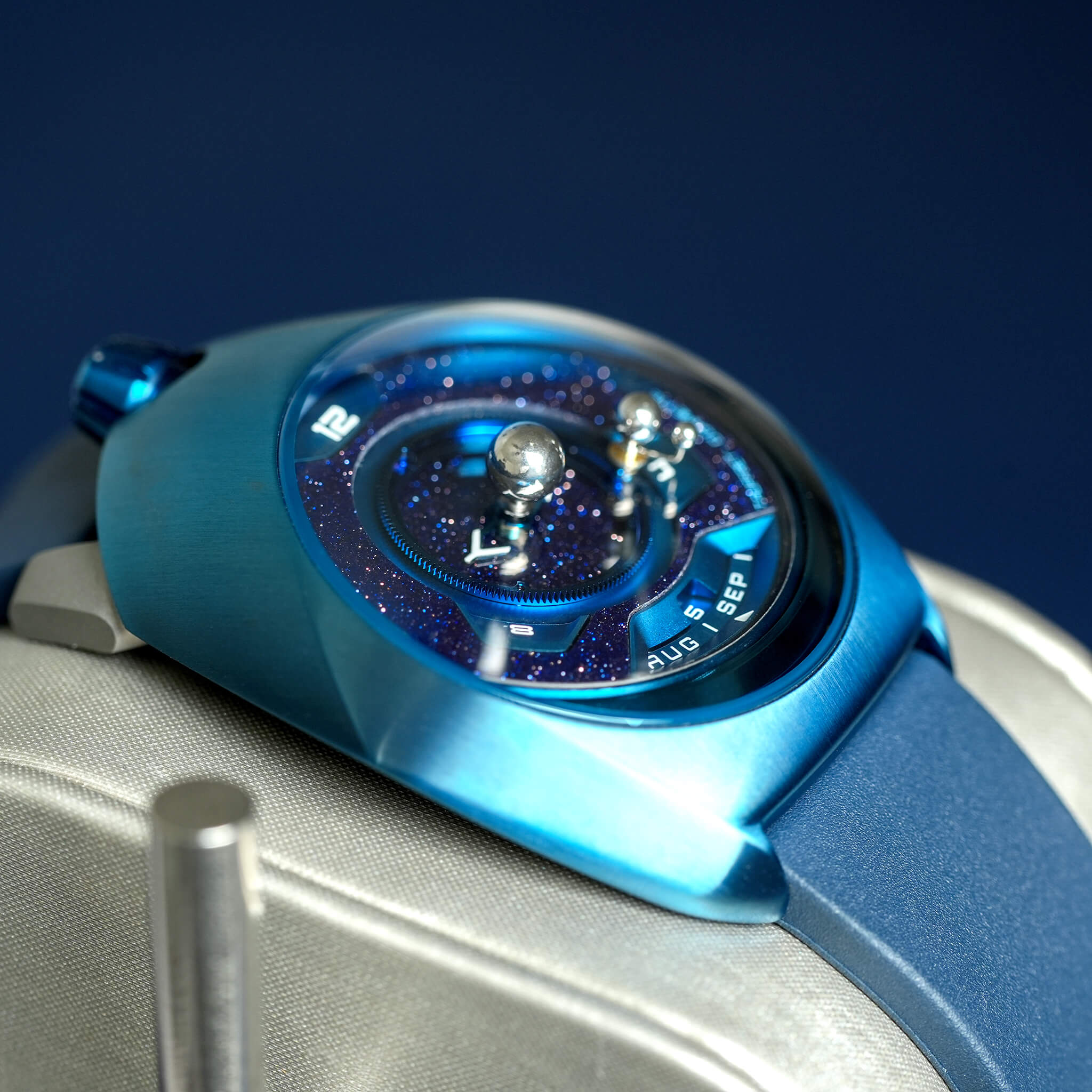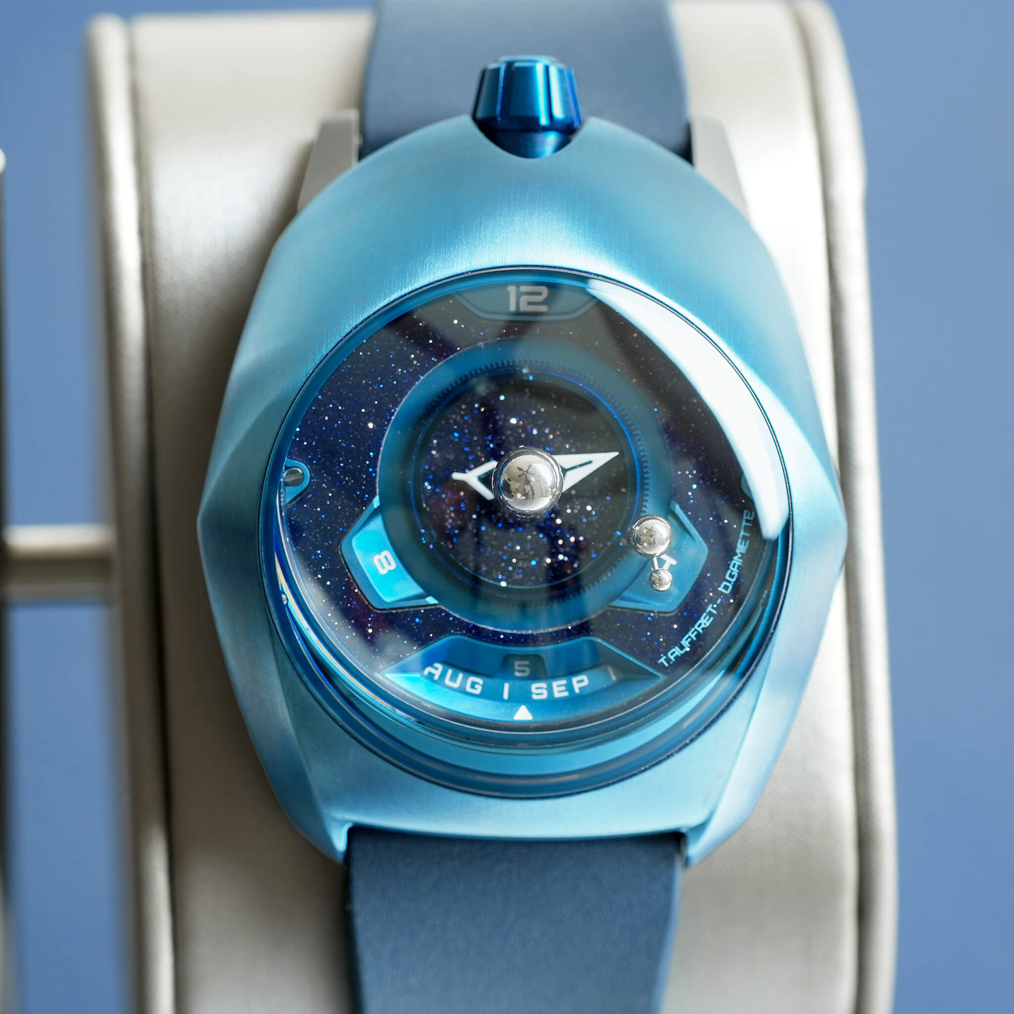 The SpaceOne Tellurium 42mm Titanium (2024) is a visionary interpretation of astronomical mechanics, blending sleek design with celestial complications via the patented Tellurium module. Crafted in grade-5 titanium and featuring a domed sapphire crystal over an aventurine dial, it houses a Soprod P024 automatic movement married to a heliocentric display of Earth, Moon, and Sun, along with calendar functions. The case defies conventional geometry — smooth, curved, and “pebble-like” in profile — while maintaining a bold presence. Rated to 40m water resistance, this 2024 model, complete with box and papers, stands as a compelling piece of modern watchmaking built between France and Switzerland.