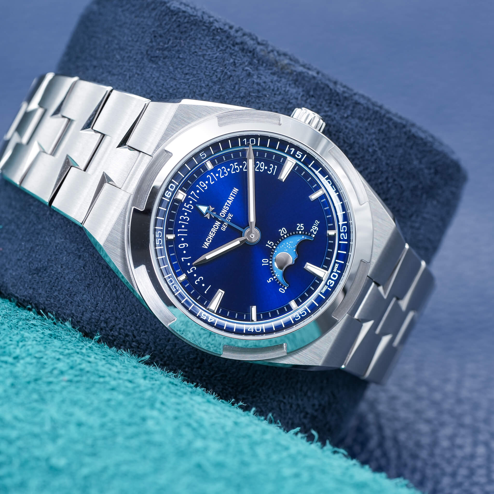 The Vacheron Constantin Overseas Moonphase Retrograde 41mm (Ref. 4000V) masterfully blends elegant design with horological complexity, showcasing a blue dial with a retrograde date display and moonphase complication. The stainless steel case and signature Maltese cross bezel give it a refined yet sporty character, while the integrated bracelet and interchangeable strap system add versatile wearability. Powered by an in-house automatic movement, it delivers precise performance with exceptional finishing that defines Vacheron’s craftsmanship. This 2025 model, complete with box and papers, is a standout example of the Overseas line, combining modern elegance with technical sophistication.