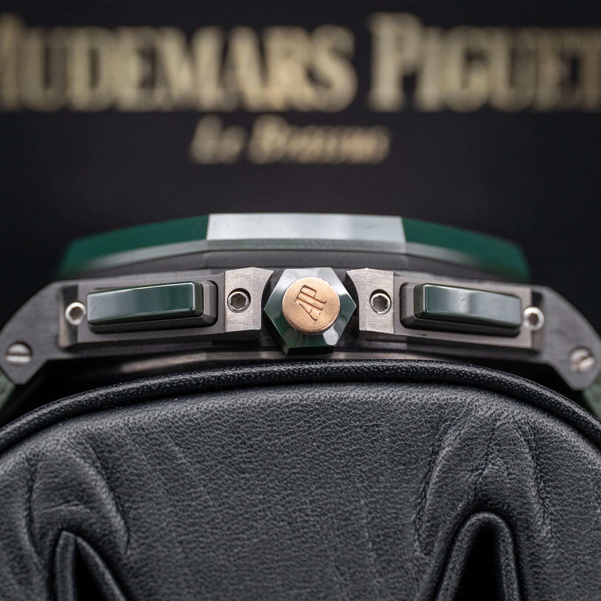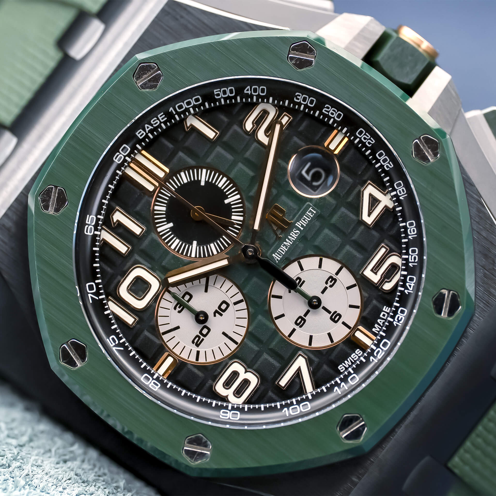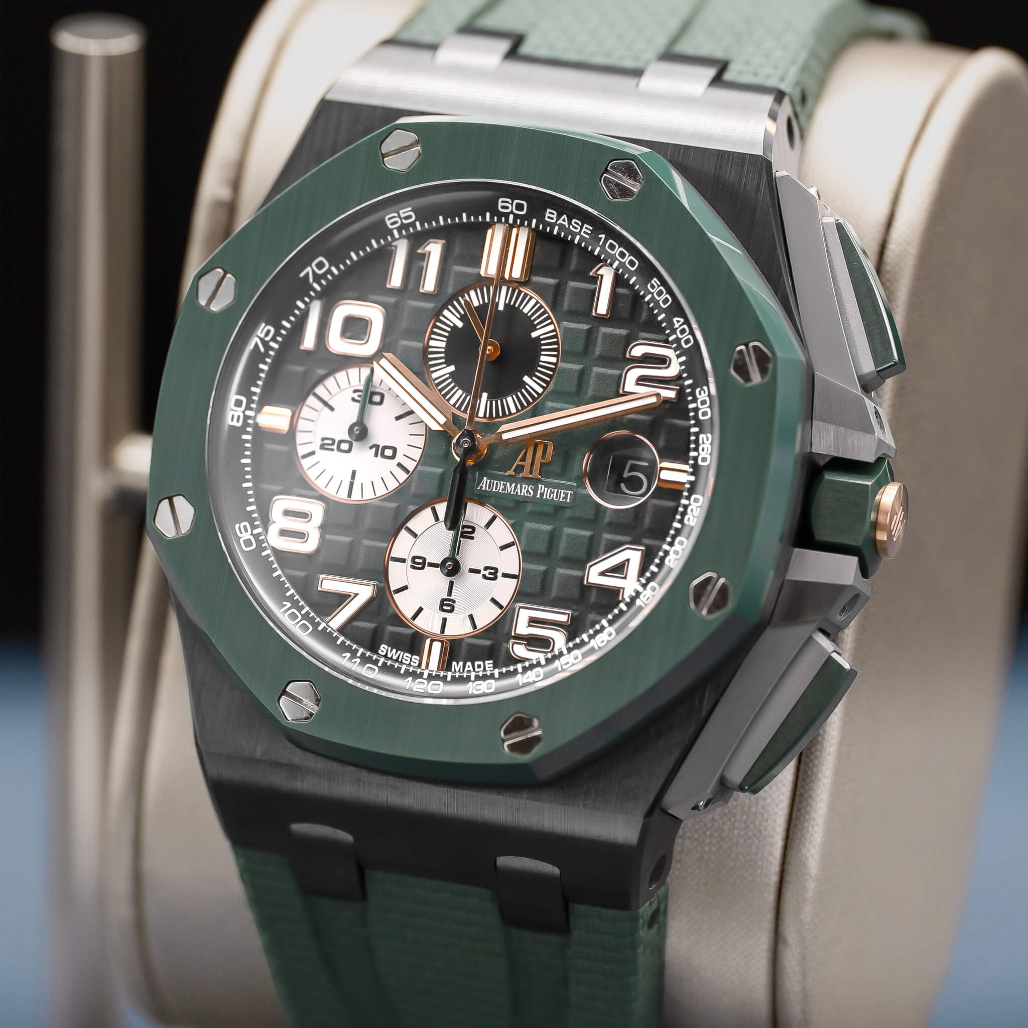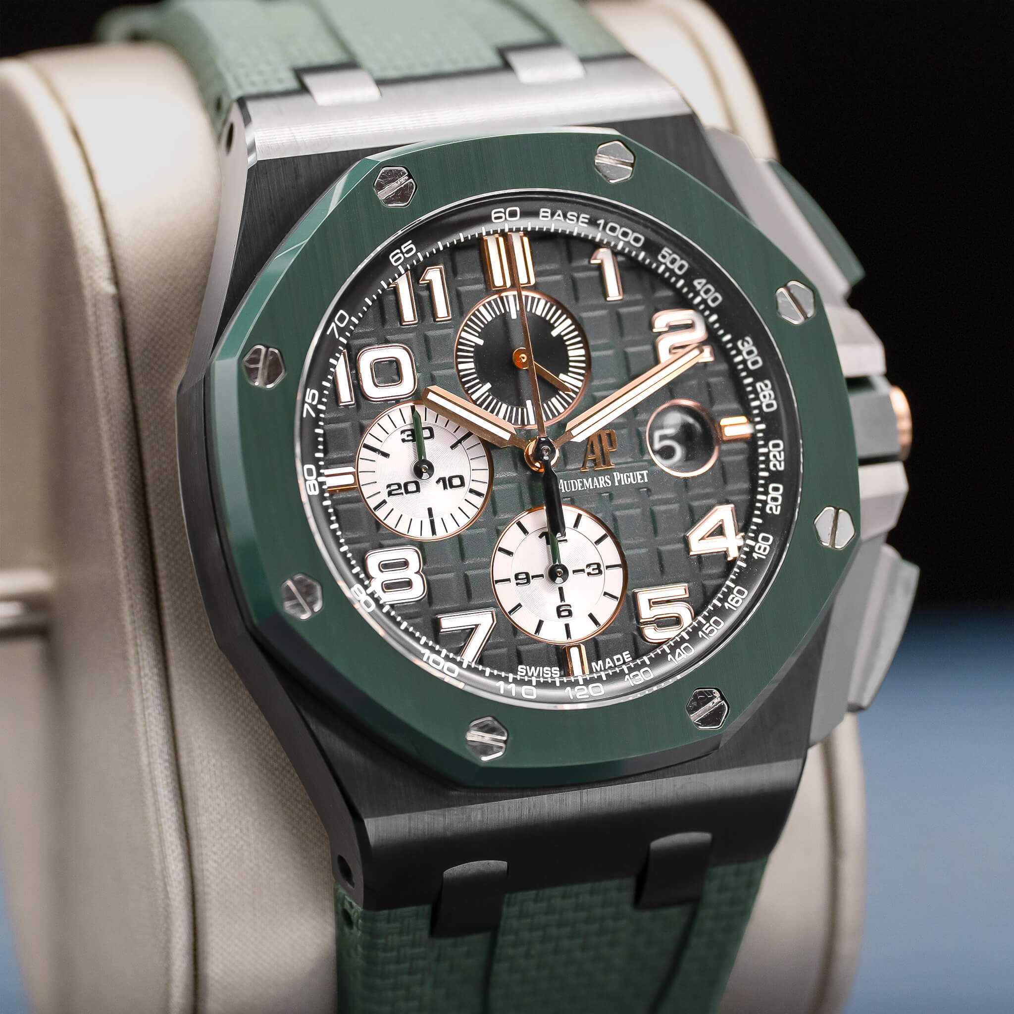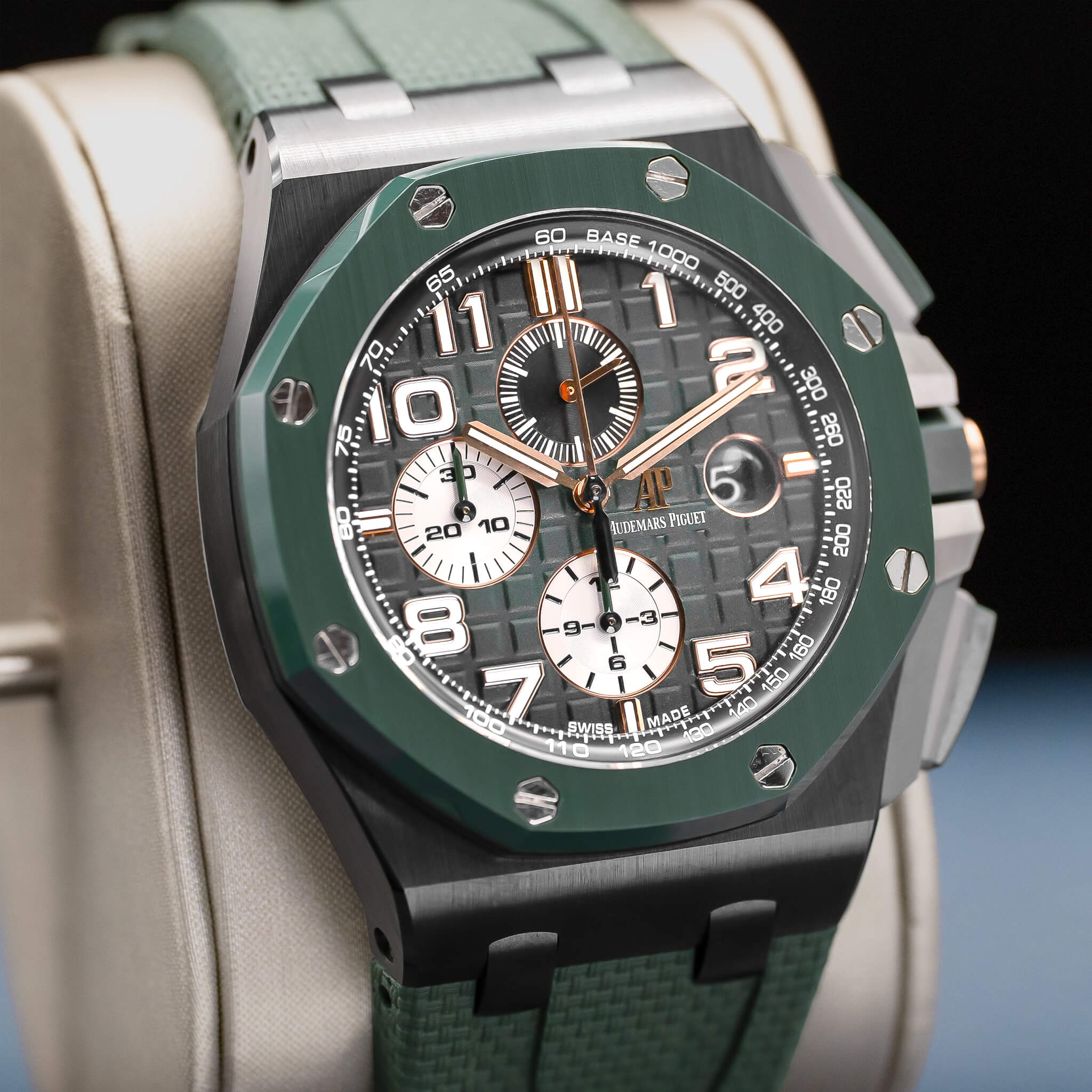 The Audemars Piguet Royal Oak Offshore Chronograph 44mm (Ref. 26405CE) combines bold styling with high-end technical performance. Featuring a black ceramic case with scratch-resistant ceramic bezel, titanium caseback, pushpiece guards, and links, it has a robust look and modern materials. The dial is anthracite with a “Méga Tapisserie” pattern, complemented by white gold applied hour markers and luminescent hands. Powered by the in-house automatic calibre 3126/3840, it delivers chronograph functionality, date, small seconds, and around 50 hours power reserve. Water resistant to 100 meters, this 2020 model, complete with box and papers, is a standout for collectors who appreciate AP’s daring design, premium materials, and Offshore boldness.