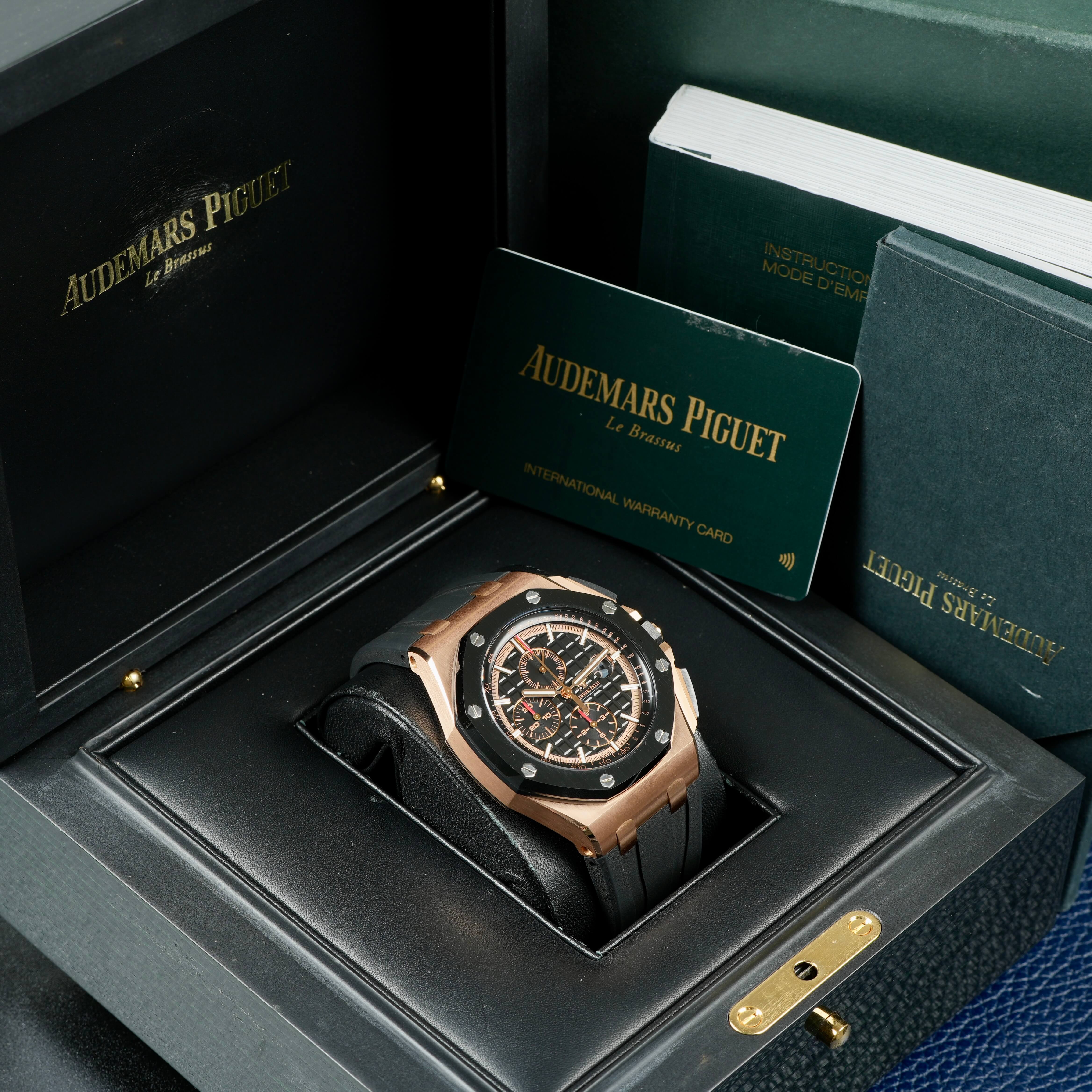 The Audemars Piguet Royal Oak Offshore Chronograph 44mm (reference 26401RO.OO.A002CA.02) is a striking fusion of luxury and robust design, crafted for those who appreciate bold aesthetics and exceptional craftsmanship. Its 18-carat pink gold case harmoniously contrasts with the black ceramic bezel, pushpieces, and screw-locked crown, creating a distinctive and sophisticated appearance. The black "Méga Tapisserie" patterned dial adds depth and texture, enhancing its visual appeal. Equipped with a chronograph function and a selfwinding movement, this timepiece offers both functionality and precision. The black rubber strap ensures comfort and durability, making it suitable for both formal occasions and adventurous pursuits. This Royal Oak Offshore model embodies Audemars Piguet's commitment to innovation and timeless design, making it a coveted piece for watch enthusiasts.