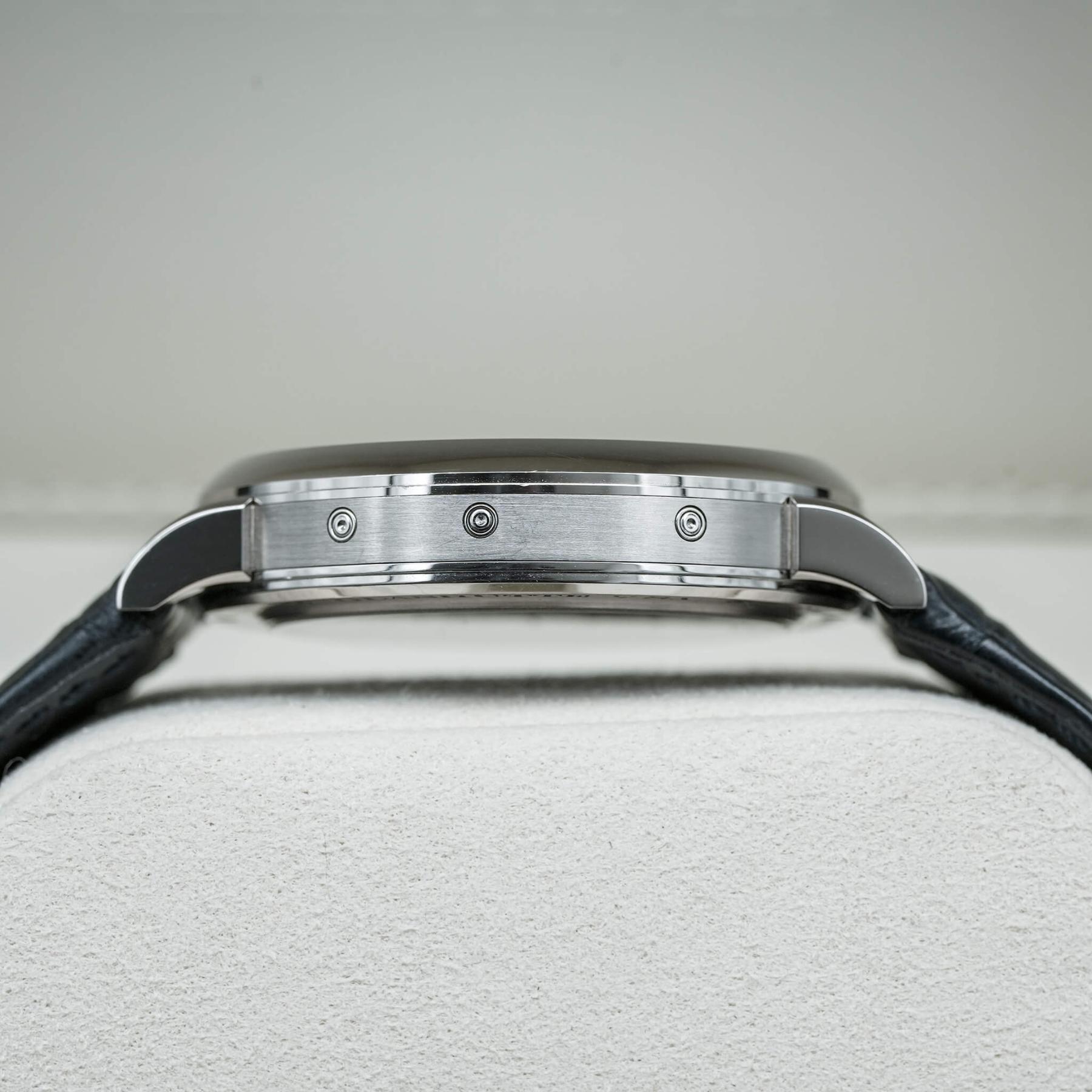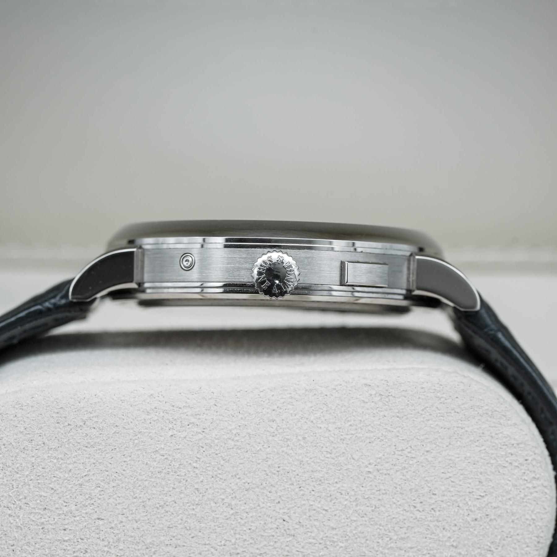 The A. Lange & Söhne 1815 Annual Calendar 40mm (Ref. 238.026) is a masterful example of high German watchmaking, combining classical design with exceptional mechanical complexity. Crafted in white gold, this reference features a beautifully balanced dial layout inspired by historic pocket watches, with separate indications for day, date, month, moonphase, and a prominent power reserve display—all arranged with remarkable clarity and symmetry. Powered by the meticulously hand-finished Caliber L051.3 manual-wind movement, it showcases Lange’s signature three-quarter plate, engraved balance cock, and exceptional depth visible through the sapphire caseback. Elegant yet technically impressive, the 1815 Annual Calendar is a statement of horological artistry and restraint. This 2022 example, complete with box and papers, represents a rare opportunity to acquire one of Lange’s most refined and sophisticated complications in precious metal.