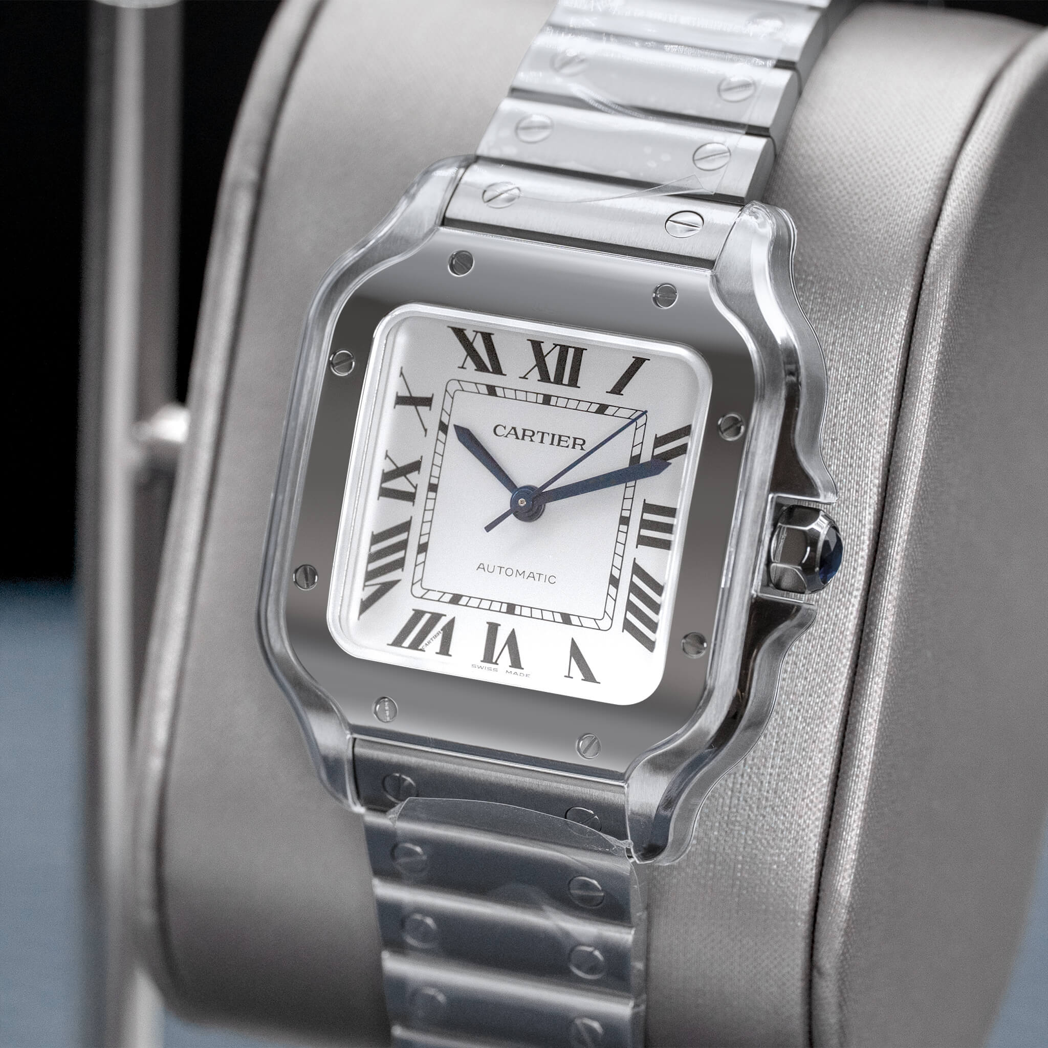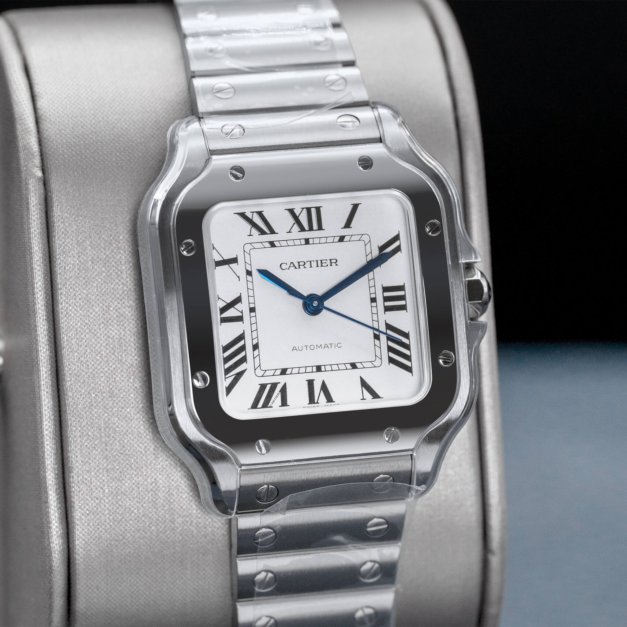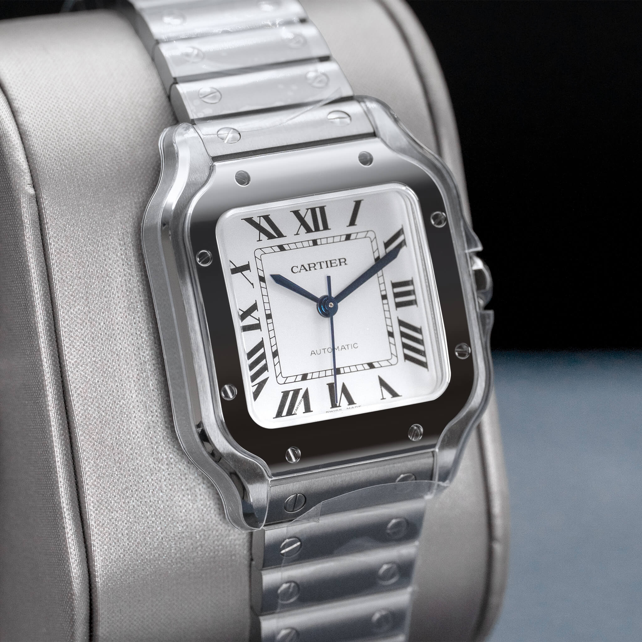 The Cartier Santos de Cartier Medium (Ref. WSSA0029) delivers timeless elegance in a 35.1 mm stainless steel case with a silvered opaline white dial and bold Roman numerals, powered by Cartier’s automatic Caliber 1847 MC for reliable everyday wear. The integrated steel bracelet with SmartLink sizing and the included quick-change calfskin strap (both using QuickSwitch) make swapping looks effortless, while 100 m water resistance keeps it practical beyond the dress code. This 2025 New/Unworn fully stickered example, complete with box and papers, is a clean, modern take on one of watchmaking’s most iconic designs.