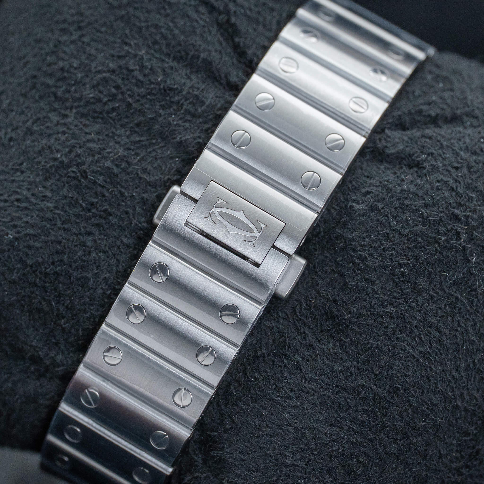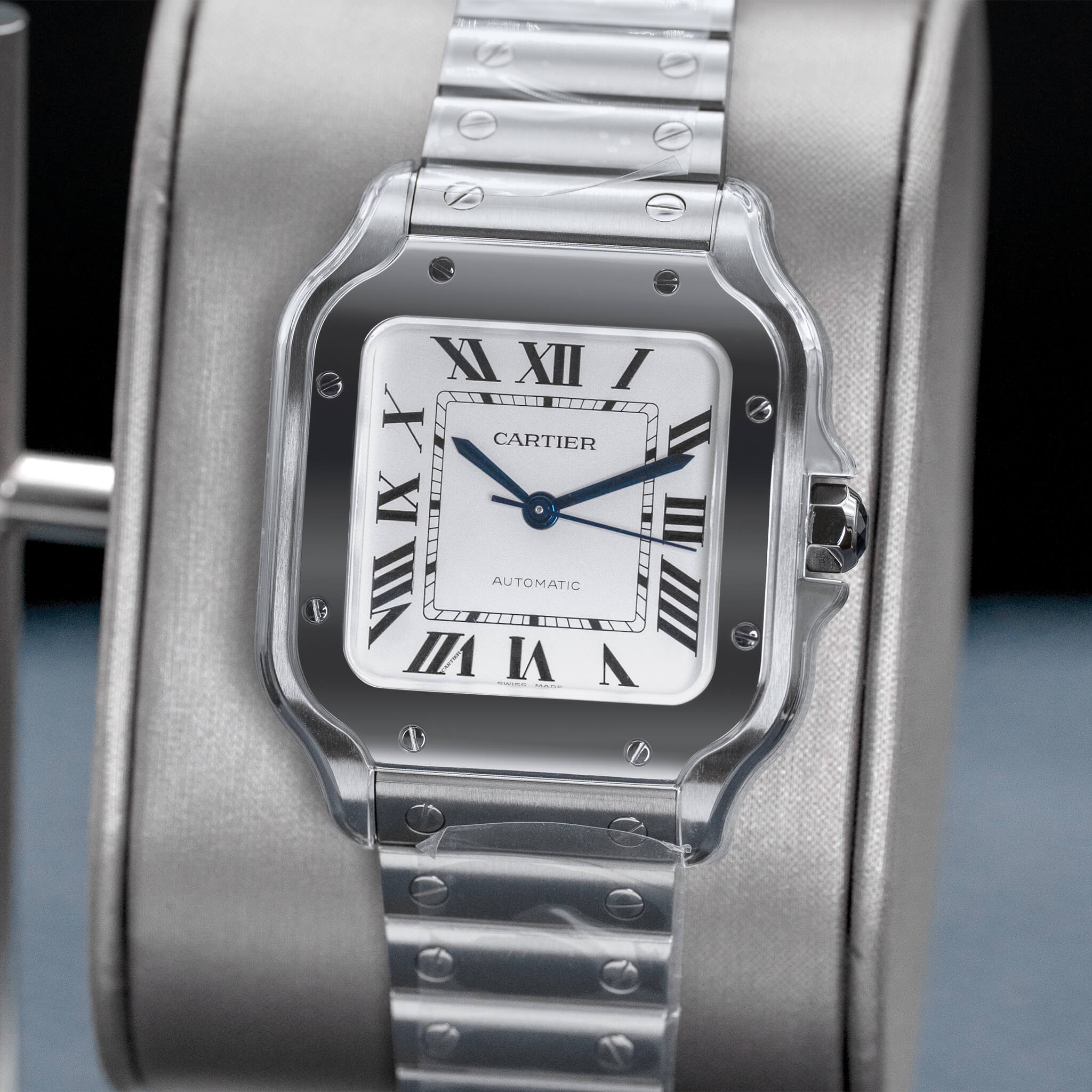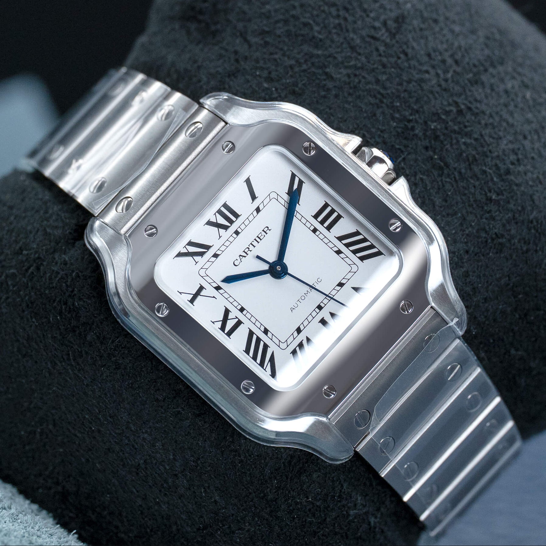 The Cartier Santos de Cartier Medium (Ref. WSSA0029) delivers timeless elegance in a 35.1 mm stainless steel case with a silvered opaline white dial and bold Roman numerals, powered by Cartier’s automatic Caliber 1847 MC for reliable everyday wear. The integrated steel bracelet with SmartLink sizing and the included quick-change calfskin strap (both using QuickSwitch) make swapping looks effortless, while 100 m water resistance keeps it practical beyond the dress code. This 2025 New/Unworn fully stickered example, complete with box and papers, is a clean, modern take on one of watchmaking’s most iconic designs.