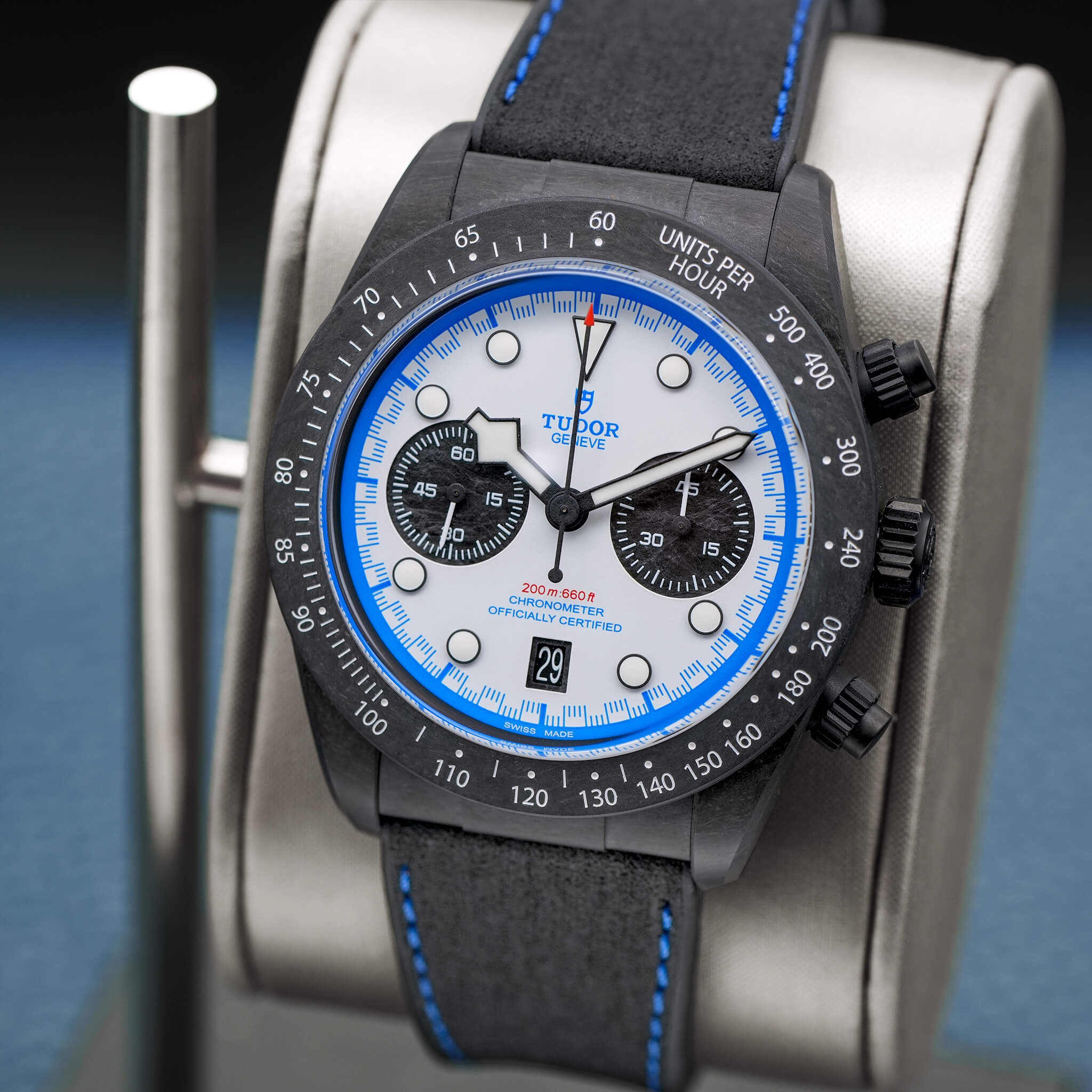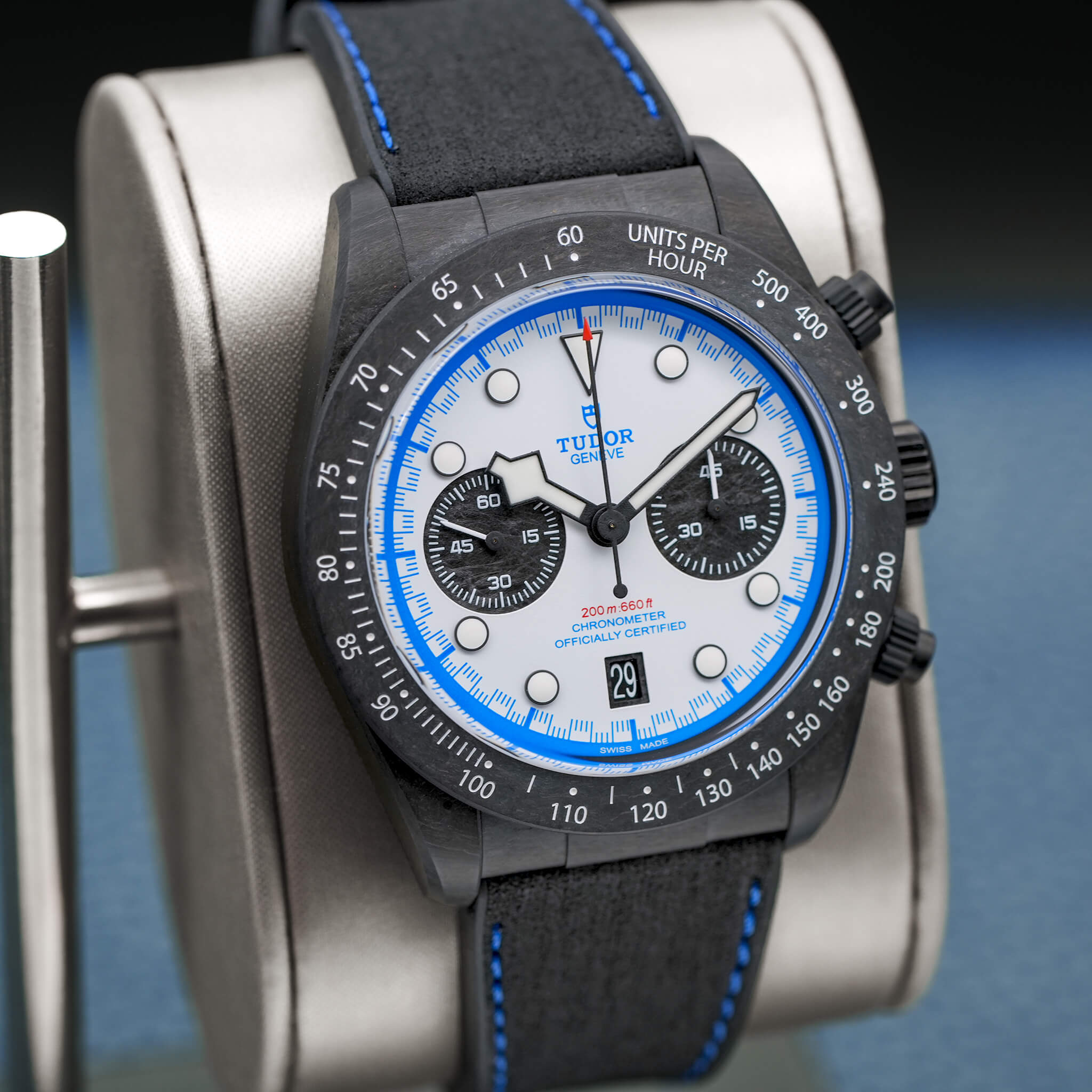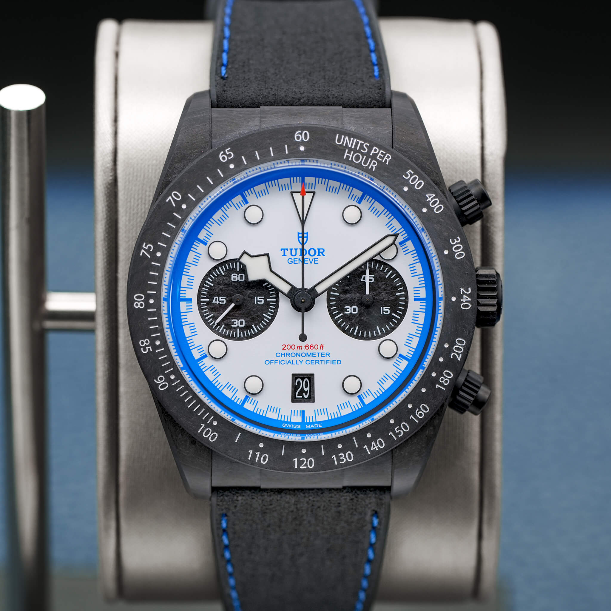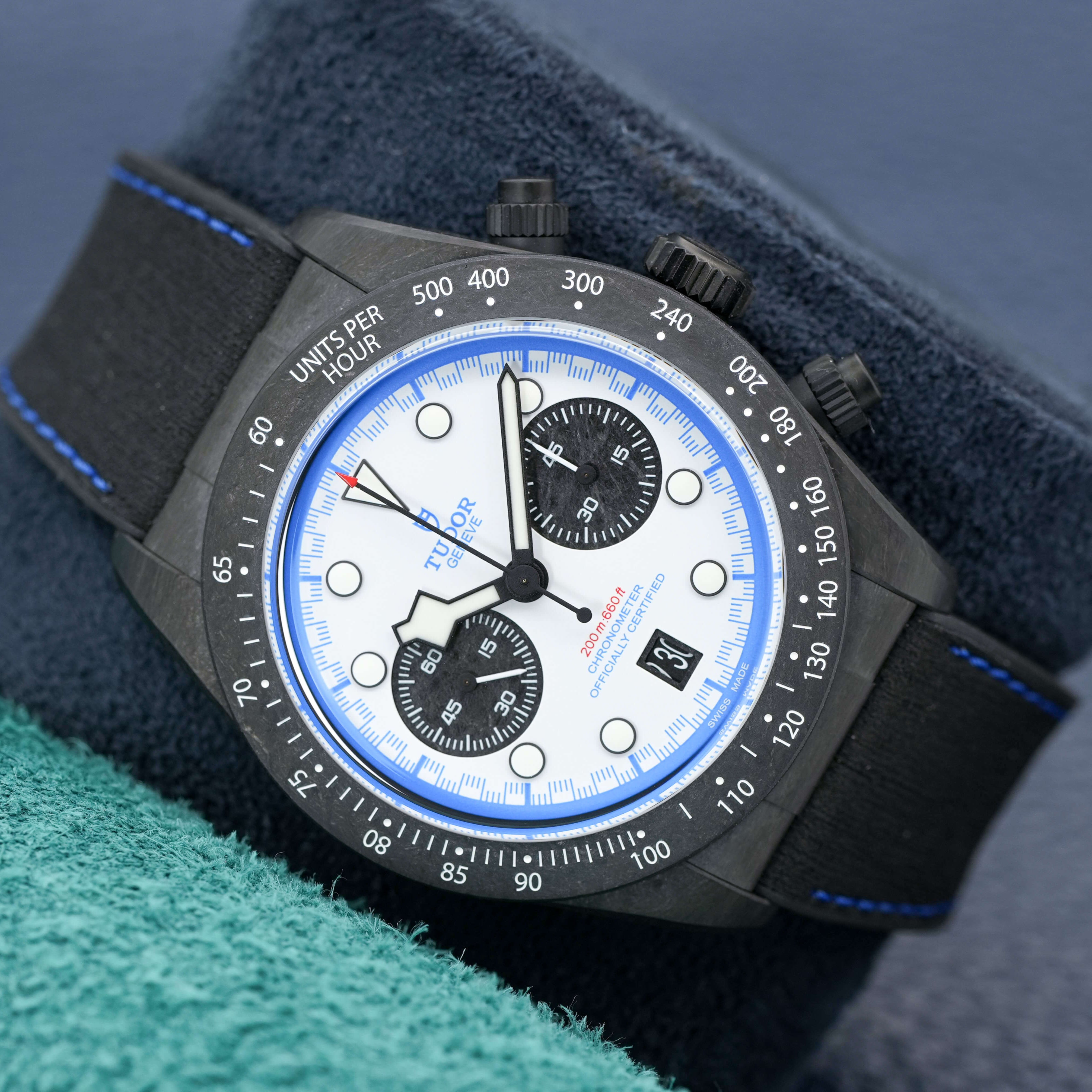 The Tudor Black Bay “Carbon 25” (Ref. M79377KN) is a limited-edition chronograph celebrating the brand’s connection to motorsport. With a 42 mm full carbon fiber case, carbon bezel, and titanium pushers/crown, it brings an ultra-light, radical aesthetic to the Black Bay lineup. Its white opaline dial with blue accents, carbon subcounters, and hybrid leather-rubber strap echo its race-inspired design. Powered by the MT5813 automatic chronograph, it offers a 70-hour power reserve, COSC certification, and 200 m water resistance. Limited to 2,025 pieces, this 2025 model, complete with box and papers, is a striking blend of performance, innovation, and bold visual identity.