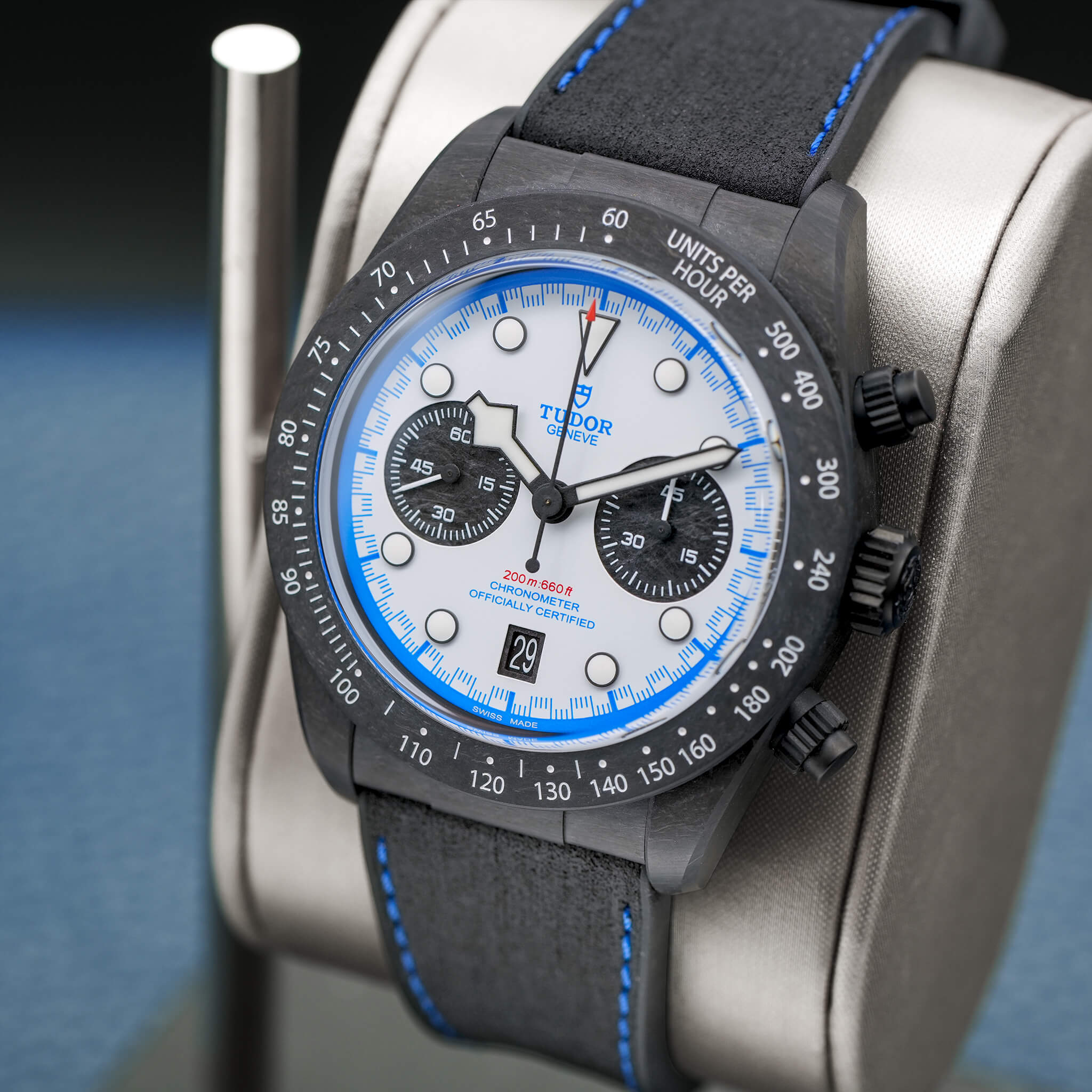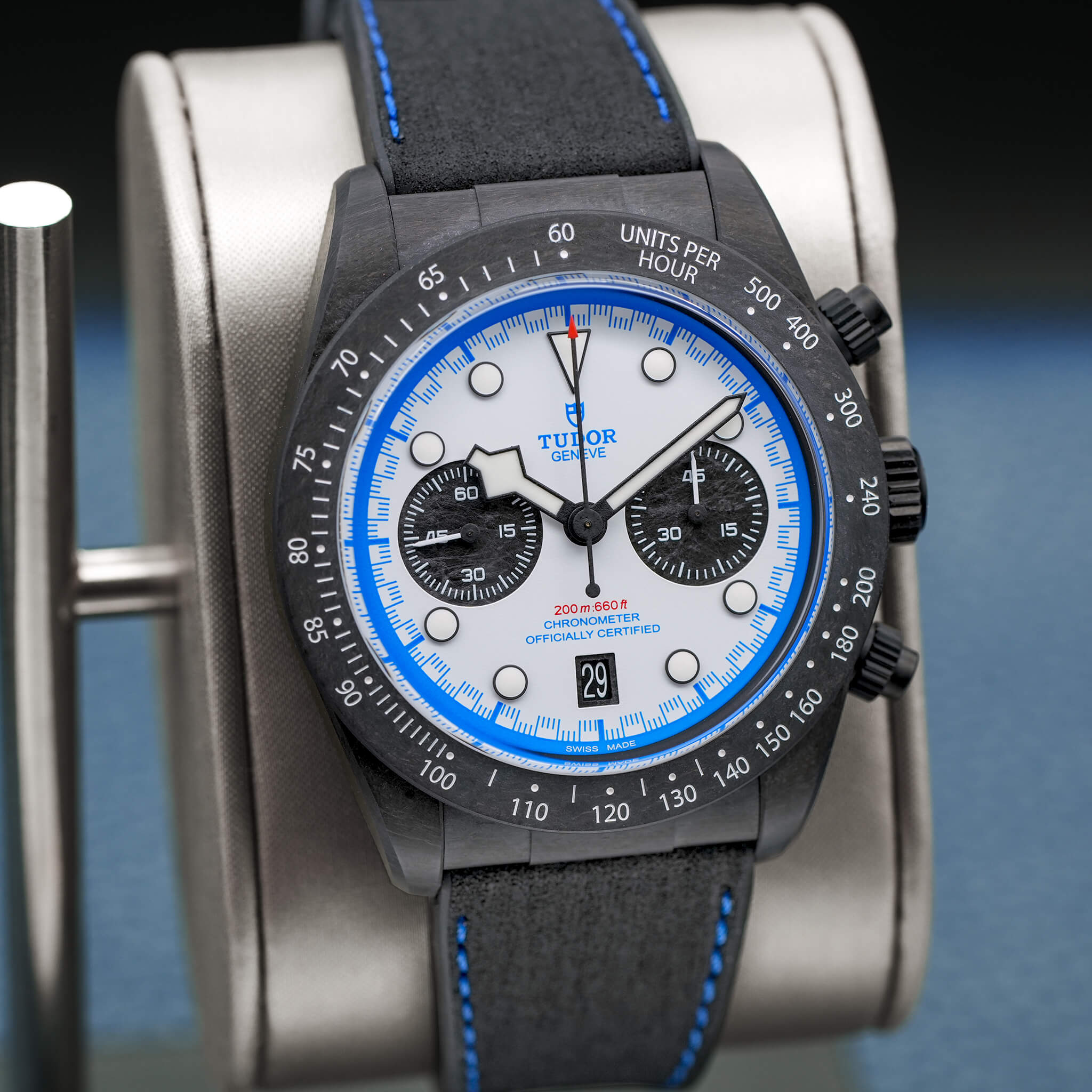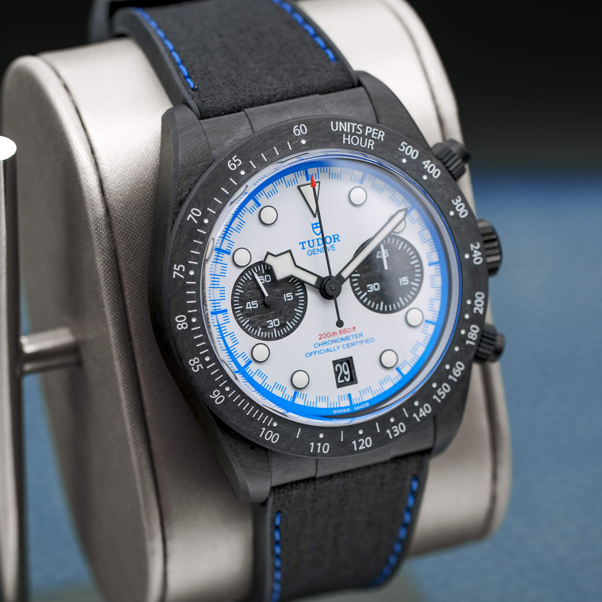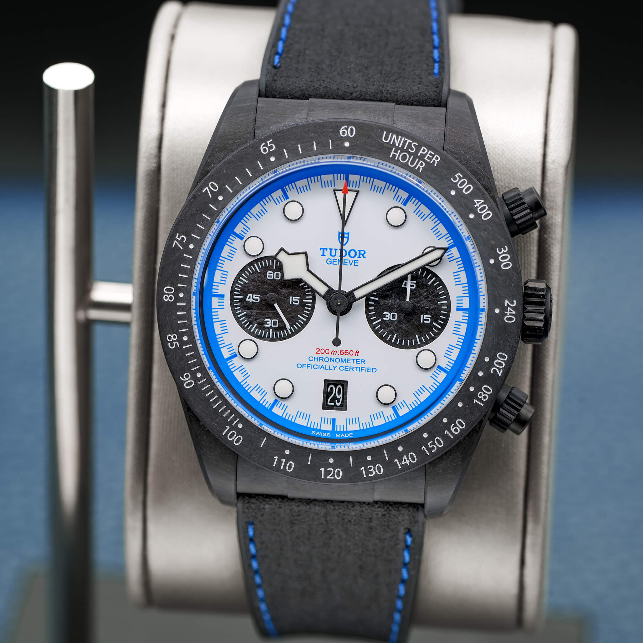 The Tudor Black Bay “Carbon 25” (Ref. M79377KN) is a limited-edition chronograph celebrating the brand’s connection to motorsport. With a 42 mm full carbon fiber case, carbon bezel, and titanium pushers/crown, it brings an ultra-light, radical aesthetic to the Black Bay lineup. Its white opaline dial with blue accents, carbon subcounters, and hybrid leather-rubber strap echo its race-inspired design. Powered by the MT5813 automatic chronograph, it offers a 70-hour power reserve, COSC certification, and 200 m water resistance. Limited to 2,025 pieces, this 2025 model, complete with box and papers, is a striking blend of performance, innovation, and bold visual identity.