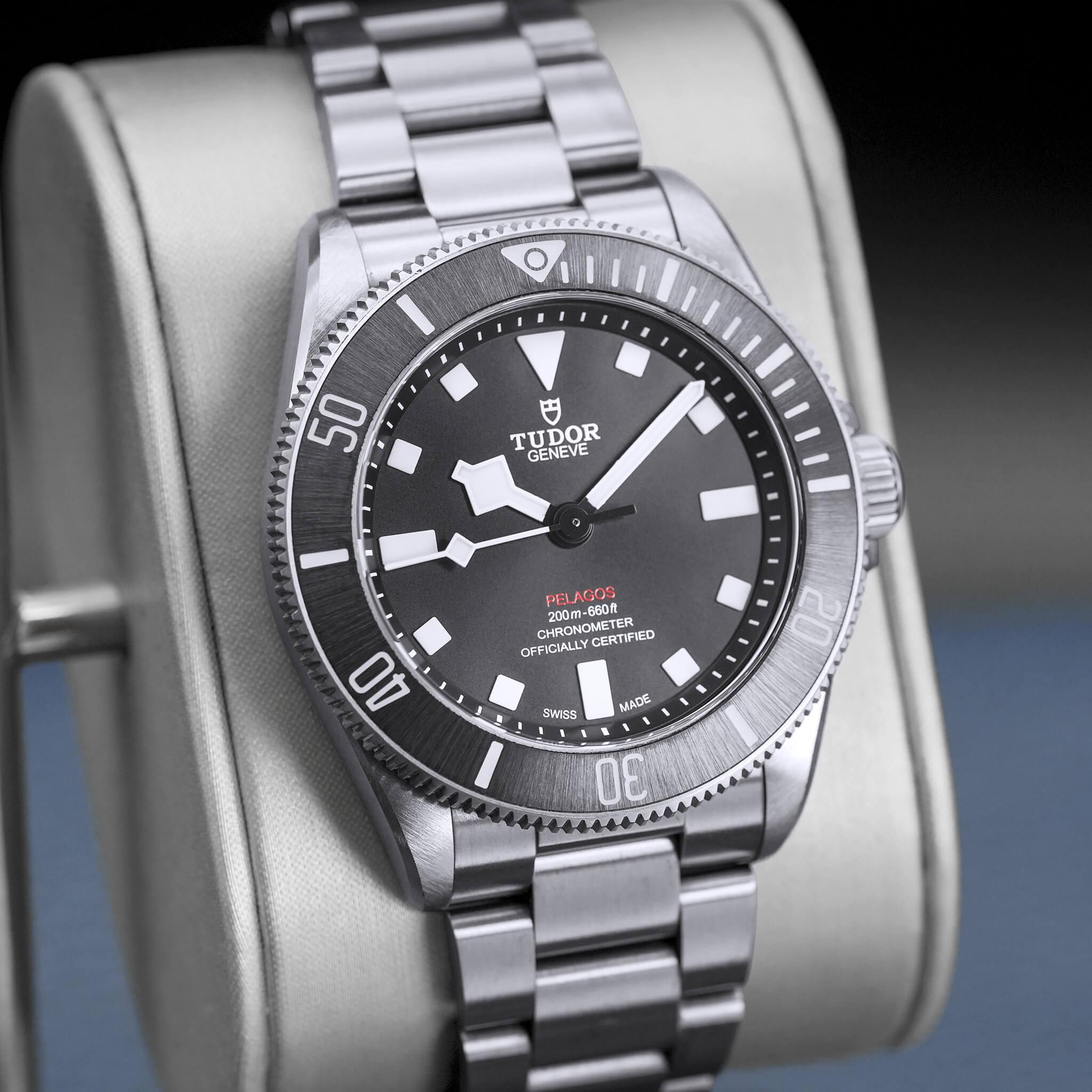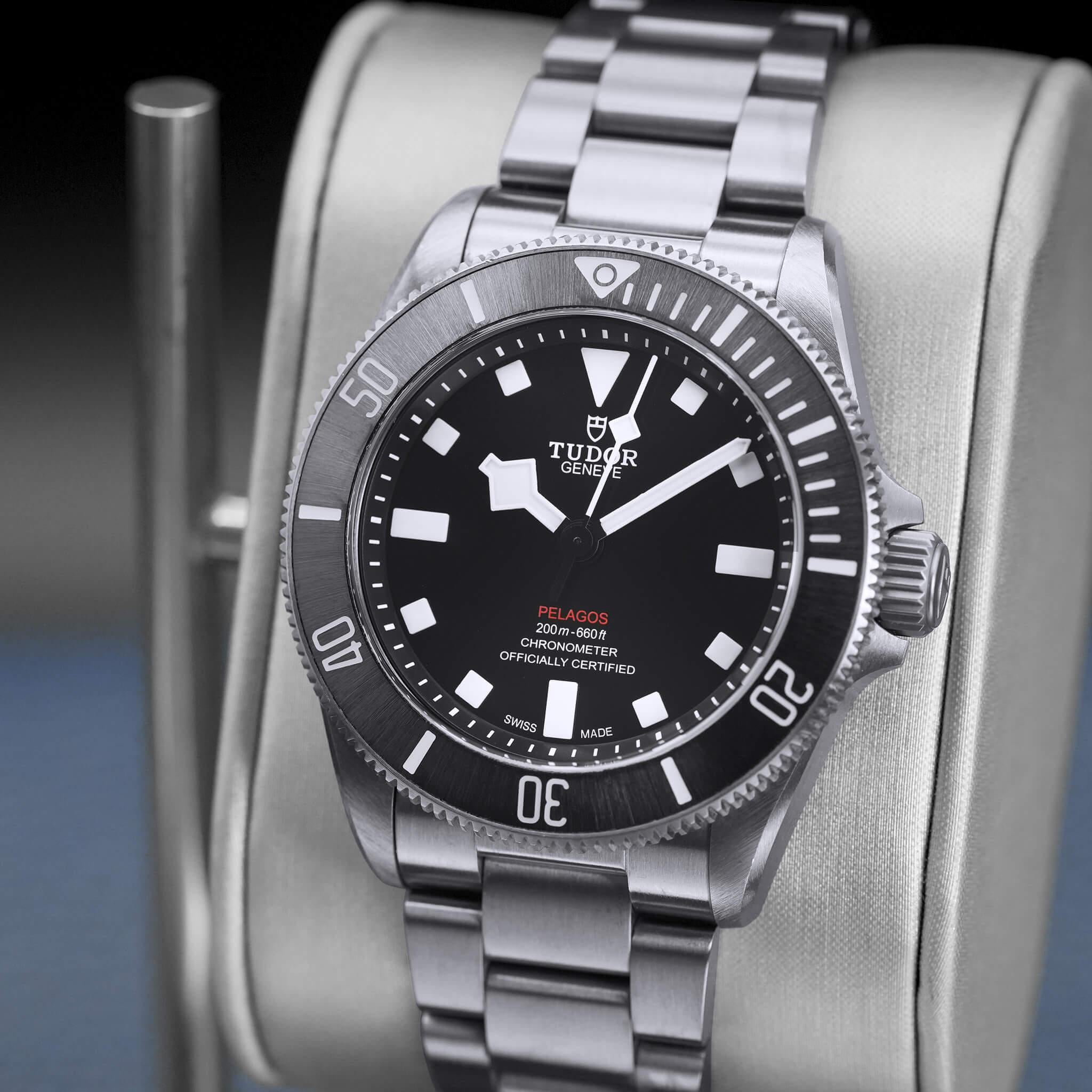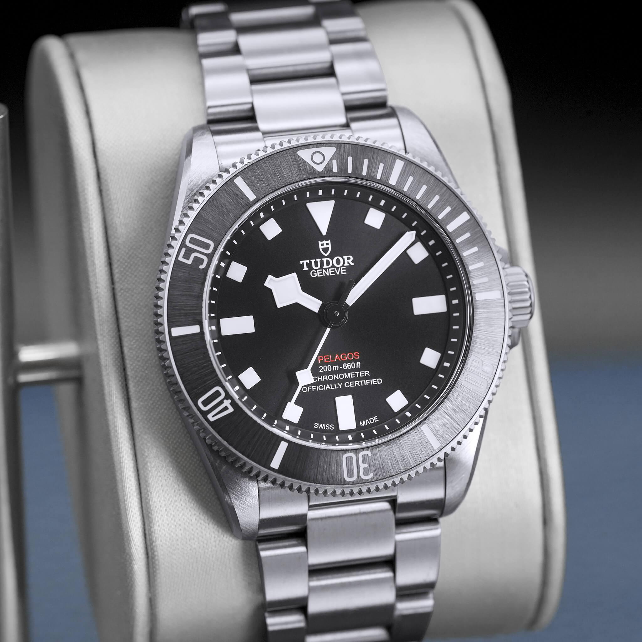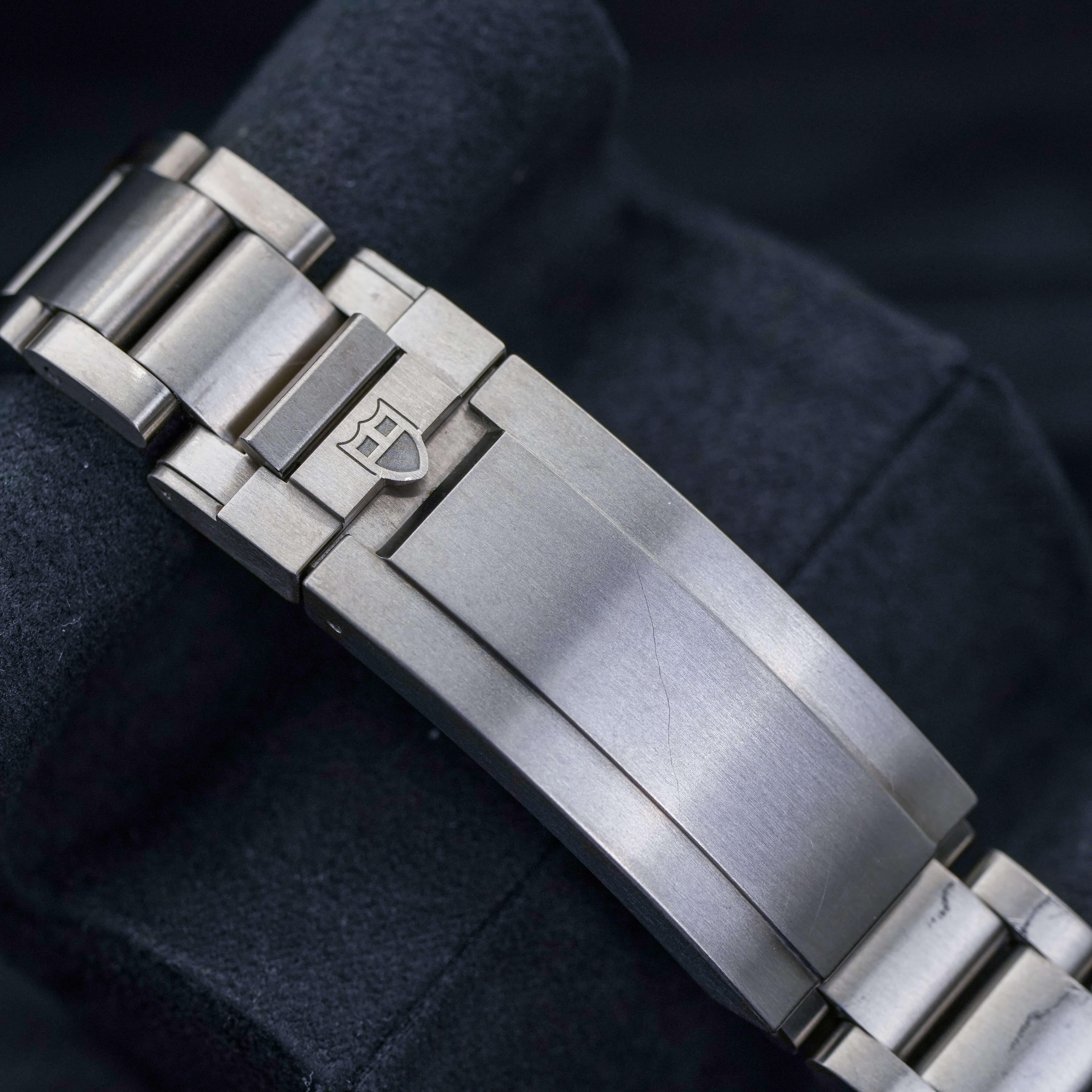 The Tudor Pelagos 39mm (Ref. 25407N) with a clean black dial is a modern and highly versatile dive watch that combines Tudor’s professional tool-watch heritage with a more compact and wearable case size. Featuring a fully satin-brushed titanium case and bracelet, a ceramic bezel, and bold luminous markers, this reference delivers excellent legibility and rugged durability while maintaining a clean, understated aesthetic. Powered by the in-house MT5400 automatic movement, it offers strong accuracy, a robust power reserve, and the reliability expected from the Pelagos line. The 39mm case provides exceptional comfort on the wrist while retaining the presence of a true dive watch. This 2023 example, complete with box and papers, is an excellent opportunity to acquire one of Tudor’s most sought-after modern tool watches—well-balanced, highly wearable, and built for everyday performance.
