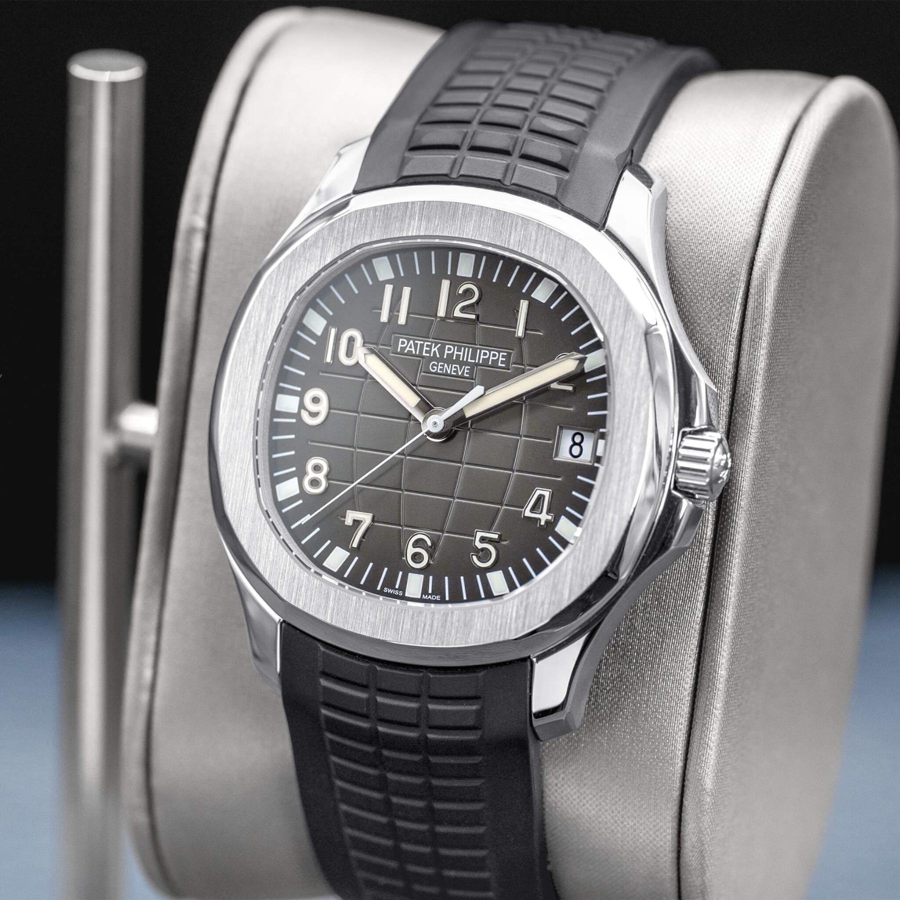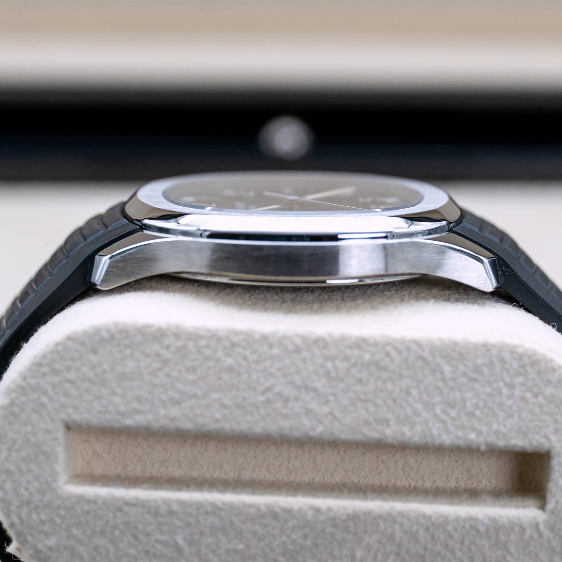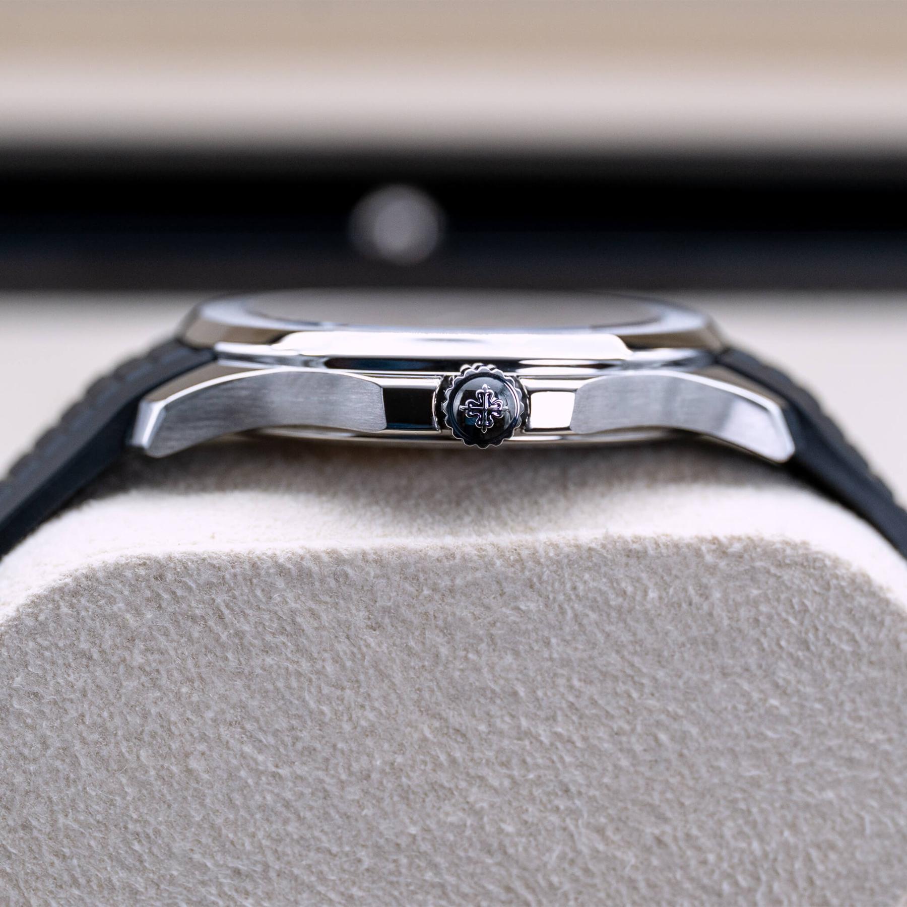 The Patek Philippe Aquanaut 40mm (Ref. 5167A) is one of the most celebrated modern sport watches, characterized by its distinctive black embossed dial, rounded octagonal case, and integrated tropical rubber strap that delivers both sophistication and everyday versatility. Powered by the in-house Caliber 324 S C, it offers excellent accuracy, robust performance, and refined finishing visible through its thoughtfully designed dial and case. The 40mm size strikes a perfect balance between presence and wearability, making it a favorite among collectors seeking a luxury sports watch that transitions effortlessly from casual to formal settings. This 2022 example, complete with box and papers, is an exceptional opportunity to add one of Patek Philippe’s most sought-after steel references to the collection—an enduring icon with strong long-term desirability.
