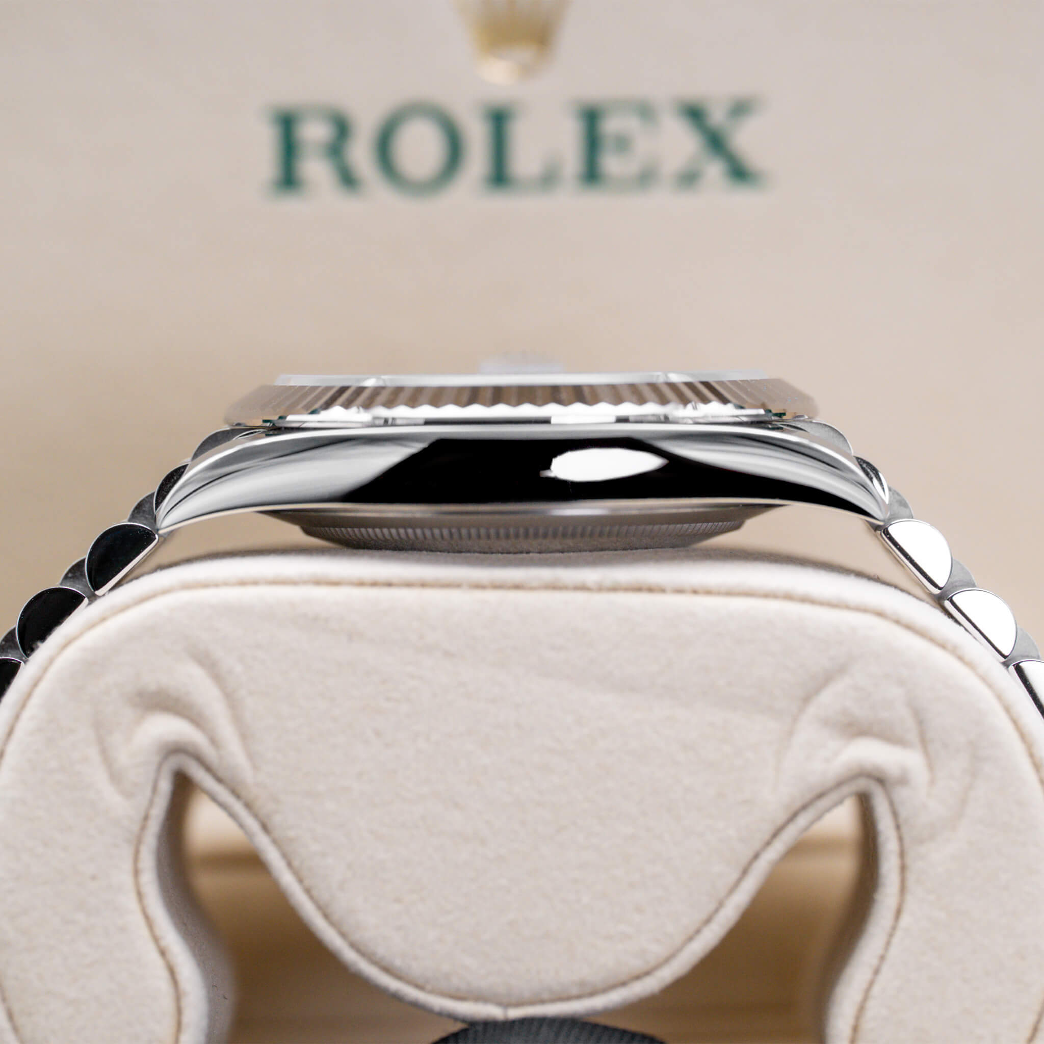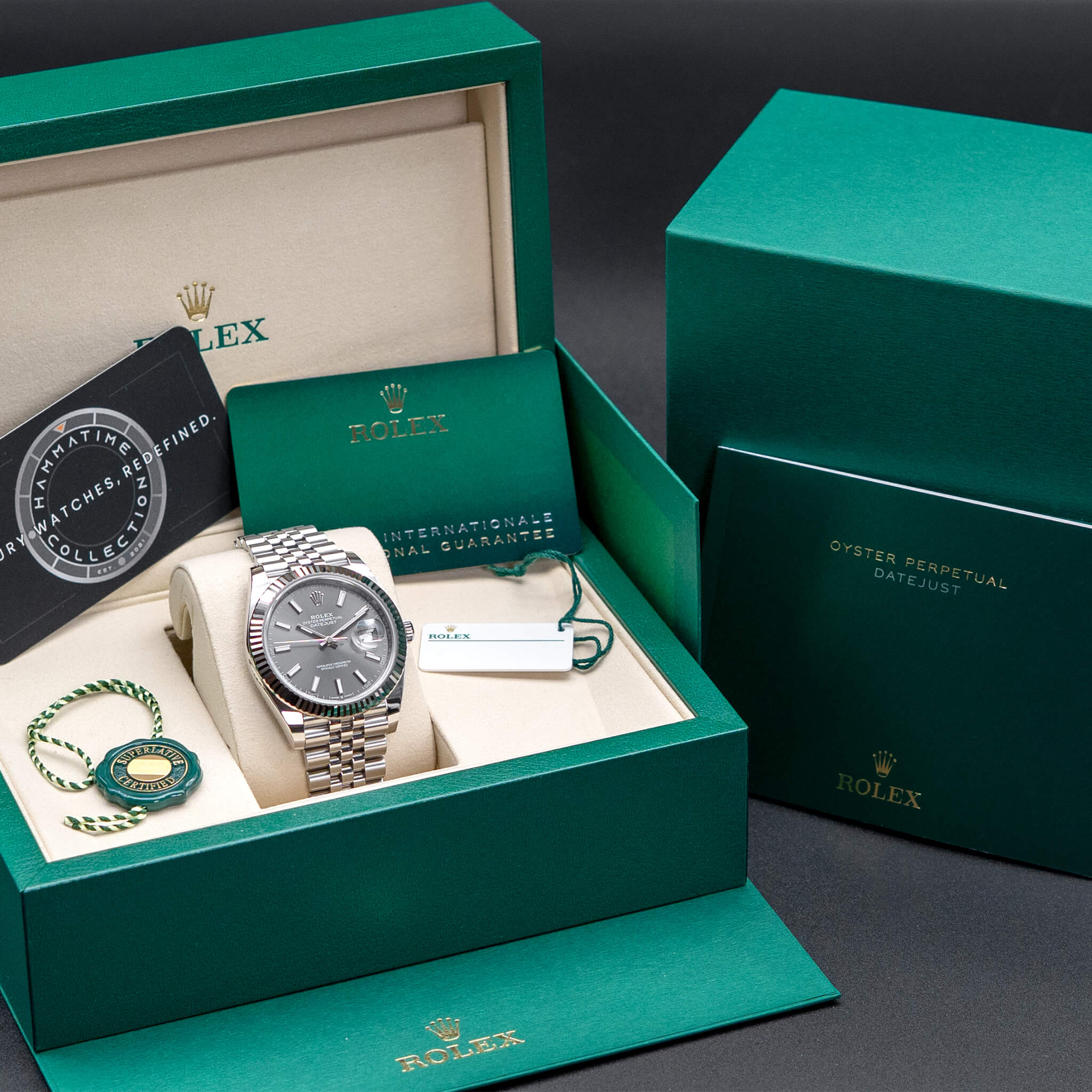 The Rolex Datejust 41mm (Ref. 126334) with a slate sunburst dial, fluted white-gold bezel, and Jubilee bracelet masterfully blends subtle elegance with timeless design. Crafted from Oystersteel and 18k white gold, this model offers a versatile and refined wrist presence. Powered by the Caliber 3235, it provides chronometer-certified precision and a 70-hour power reserve, ensuring both performance and reliability. This 2025 example, complete with box and papers, is a standout in the Datejust lineup—celebrated for its sophisticated dial color, modern build, and enduring Rolex appeal.