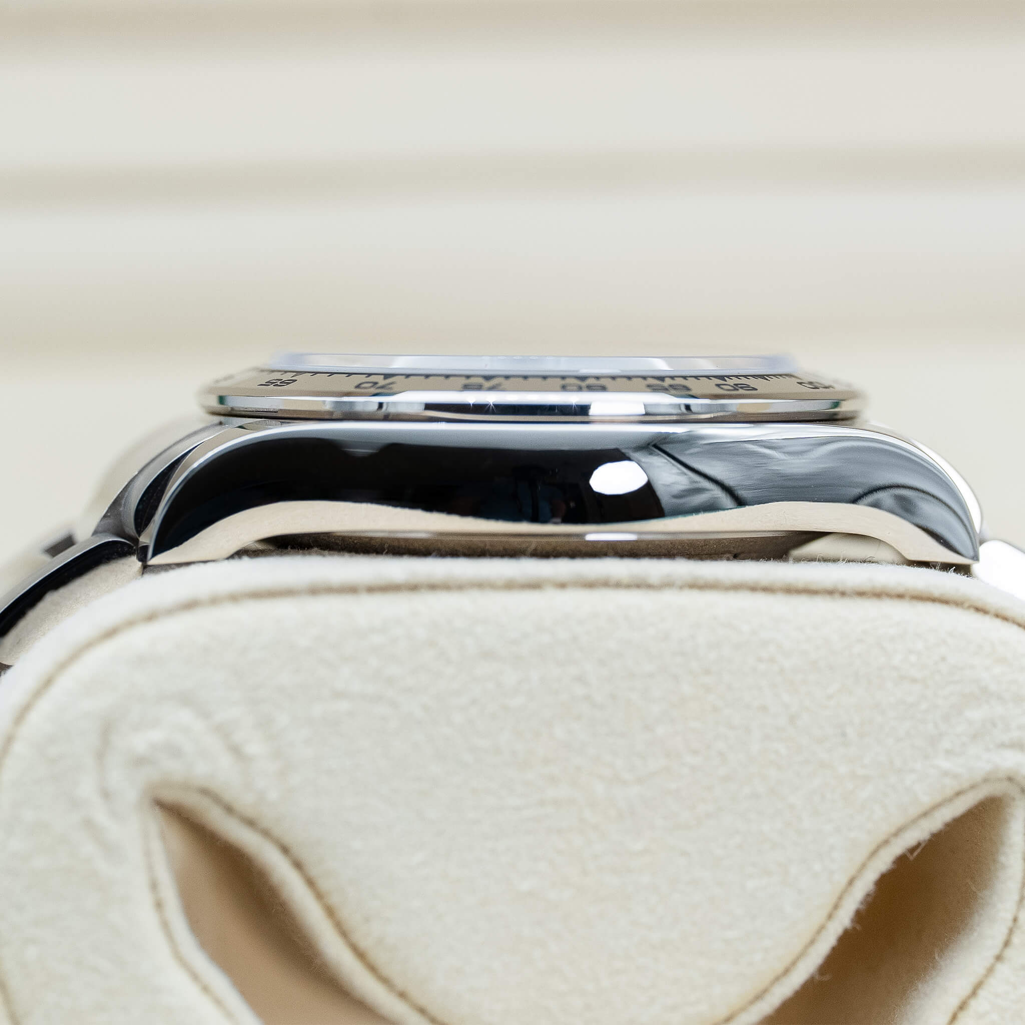 The Rolex Daytona White Gold Blue Dial 40mm (Ref. 116509) is a striking luxury chronograph, crafted entirely in 18k white gold and featuring Rolex’s in-house Caliber 4130, a 72-hour power reserve, and a fixed white-gold bezel with a tachymetric scale. The bold blue sunburst dial with crisp subdials adds sporty elegance, and the matching white-gold Oyster bracelet ensures standout wrist presence. Rated for 100 meters water resistance, this 2020 example, complete with box and papers, represents one of the most sought-after white-gold Daytona variants—combining prestige, performance, and timeless design.