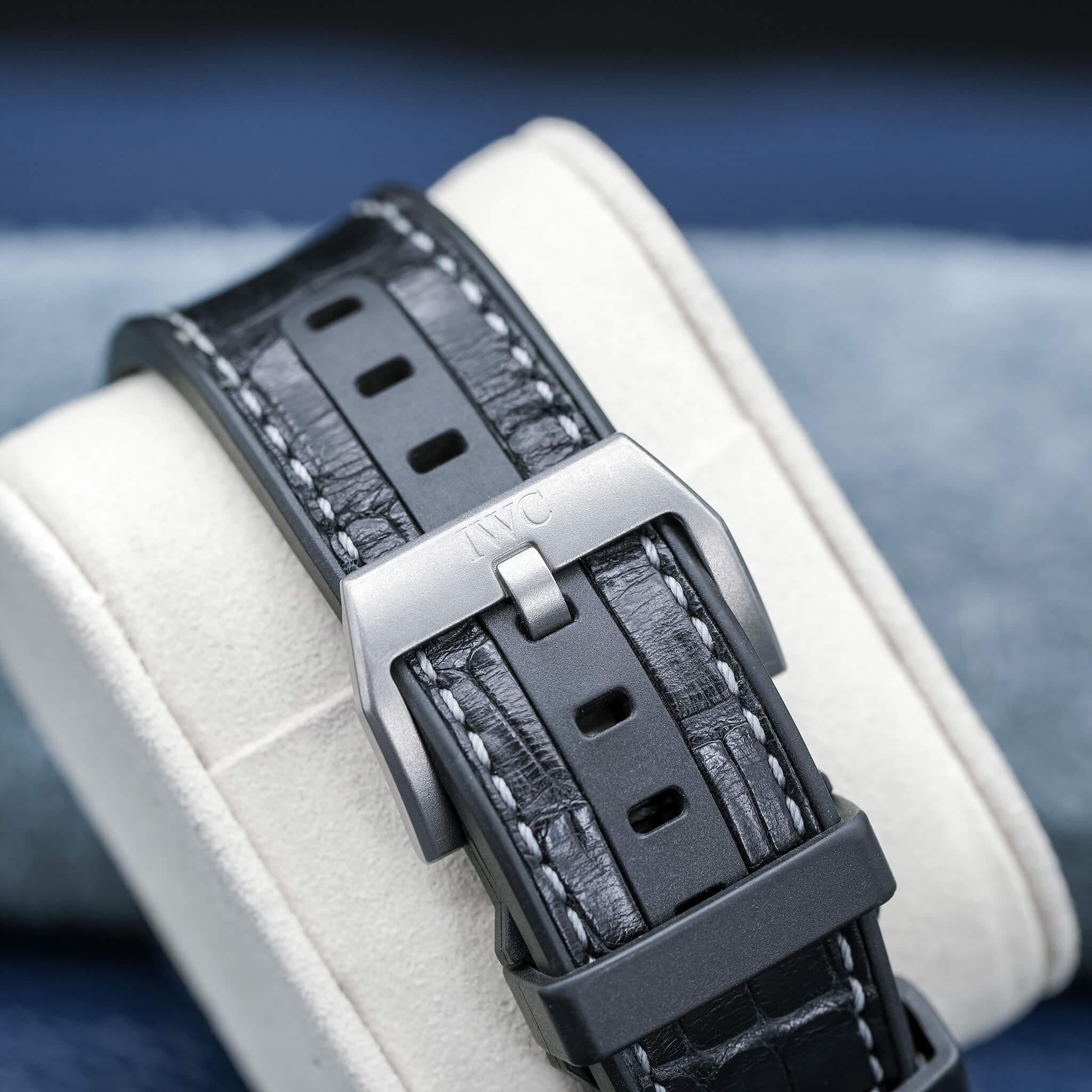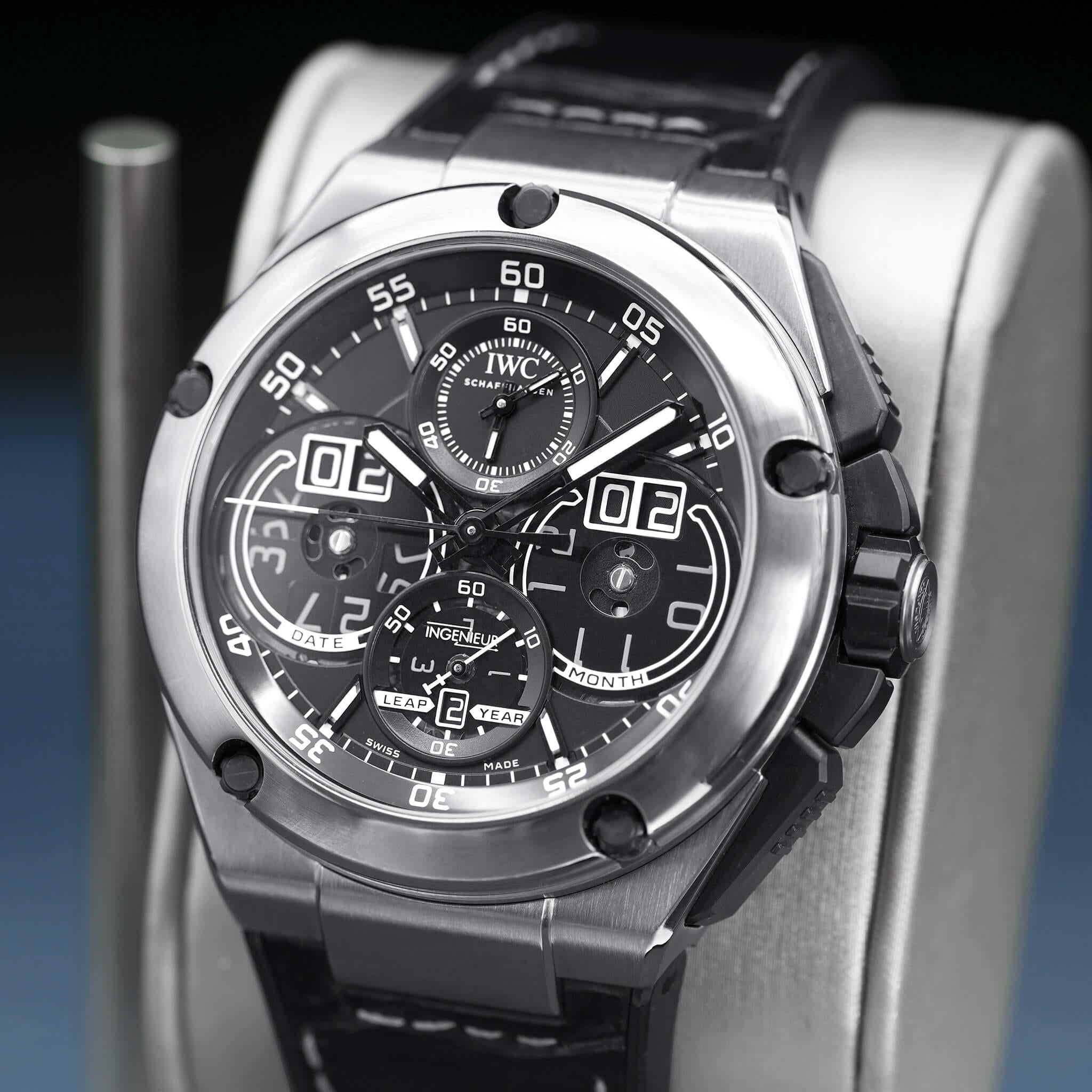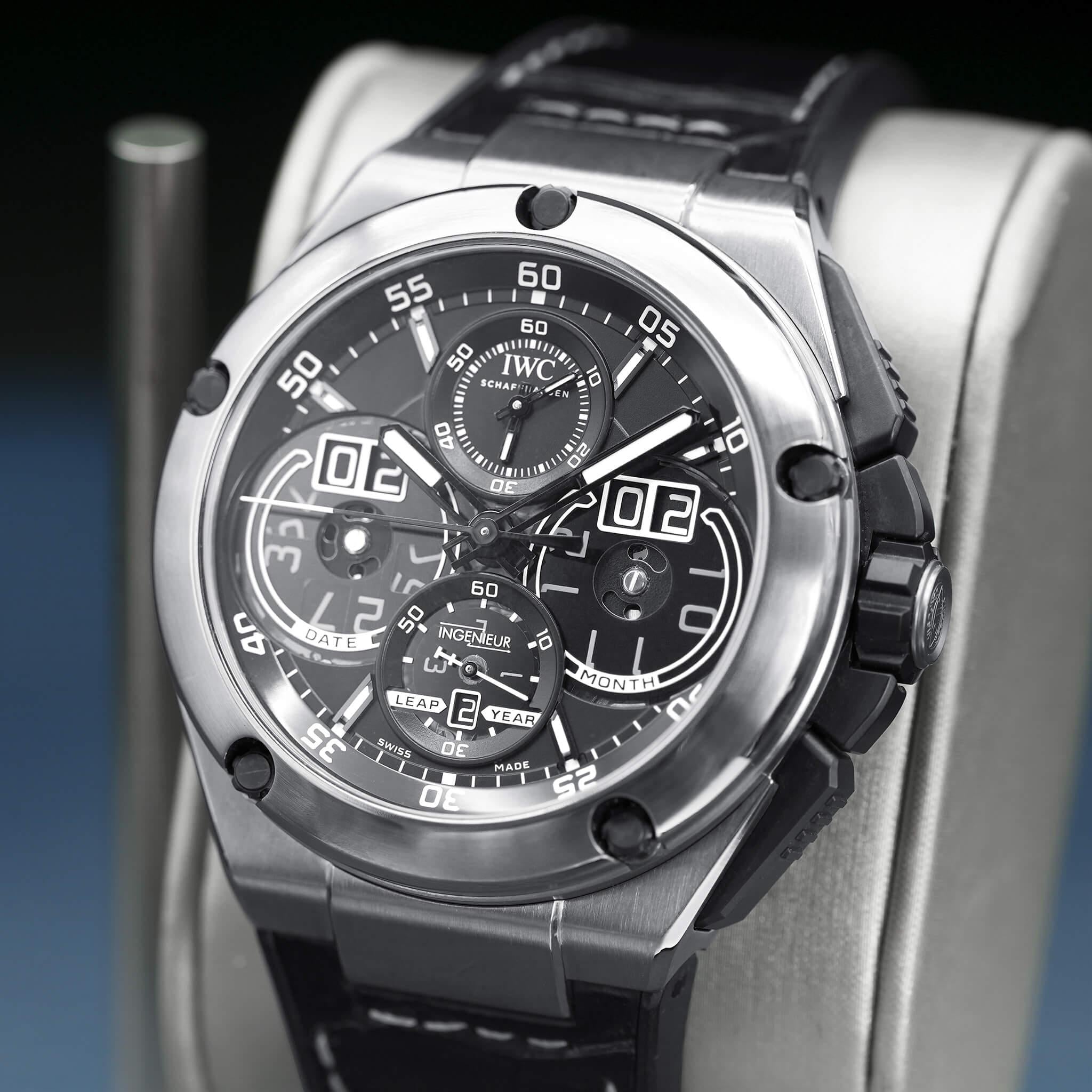 The IWC Ingenieur Perpetual Calendar (Ref. IWX379201) is a bold fusion of technical ingenuity and refined sport-luxury design, anchored by a commanding 46mm case and a richly detailed black dial that balances clarity with complexity. Featuring IWC’s sophisticated perpetual calendar complication — capable of tracking date, day, month, year, and moonphase without adjustment until 2100 — this reference highlights the brand’s prowess in high-end mechanical watchmaking. Powered by a meticulously engineered automatic movement, it delivers robust reliability, impressive precision, and the long-term performance collectors expect from IWC’s flagship complications. The Ingenieur’s distinctive case ethos — blending angular, industrial cues with ergonomic wearability — gives this piece strong wrist presence and everyday versatility. This 2022 example, is an excellent opportunity to acquire one of IWC’s most technically accomplished sport watches — a striking timepiece with enduring collector appeal.